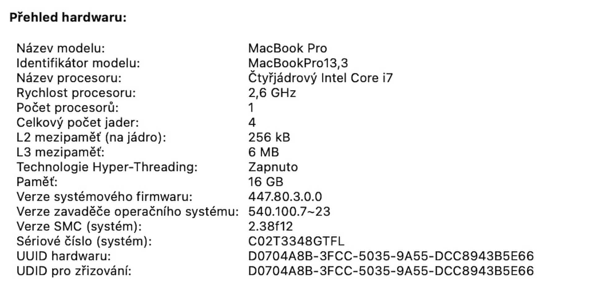 Intel Core i7 2.6 GHz Skylake, 15.4" IPS LED 2880×1800 Retina, RAM 16GB LPDDR3, Intel Iris Graphics 530 + AMD Radeon Pro 450 2GB GDDR5, SSD 256GB, WiFi 802.11ac, Bluetooth 4.2, Webkamera Facetime 720p, 4x USB-C Thunderbolt 3, Touch Bar s integrovaným snímačem Touch ID, Force Touch Trackpad, podsvícená klávesnice
