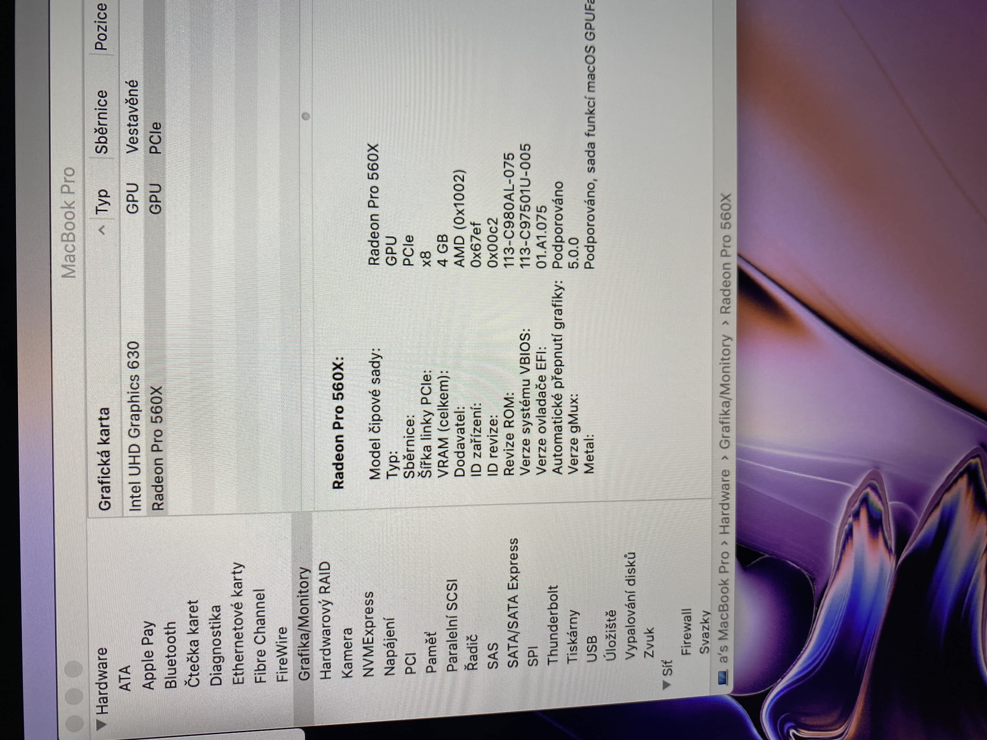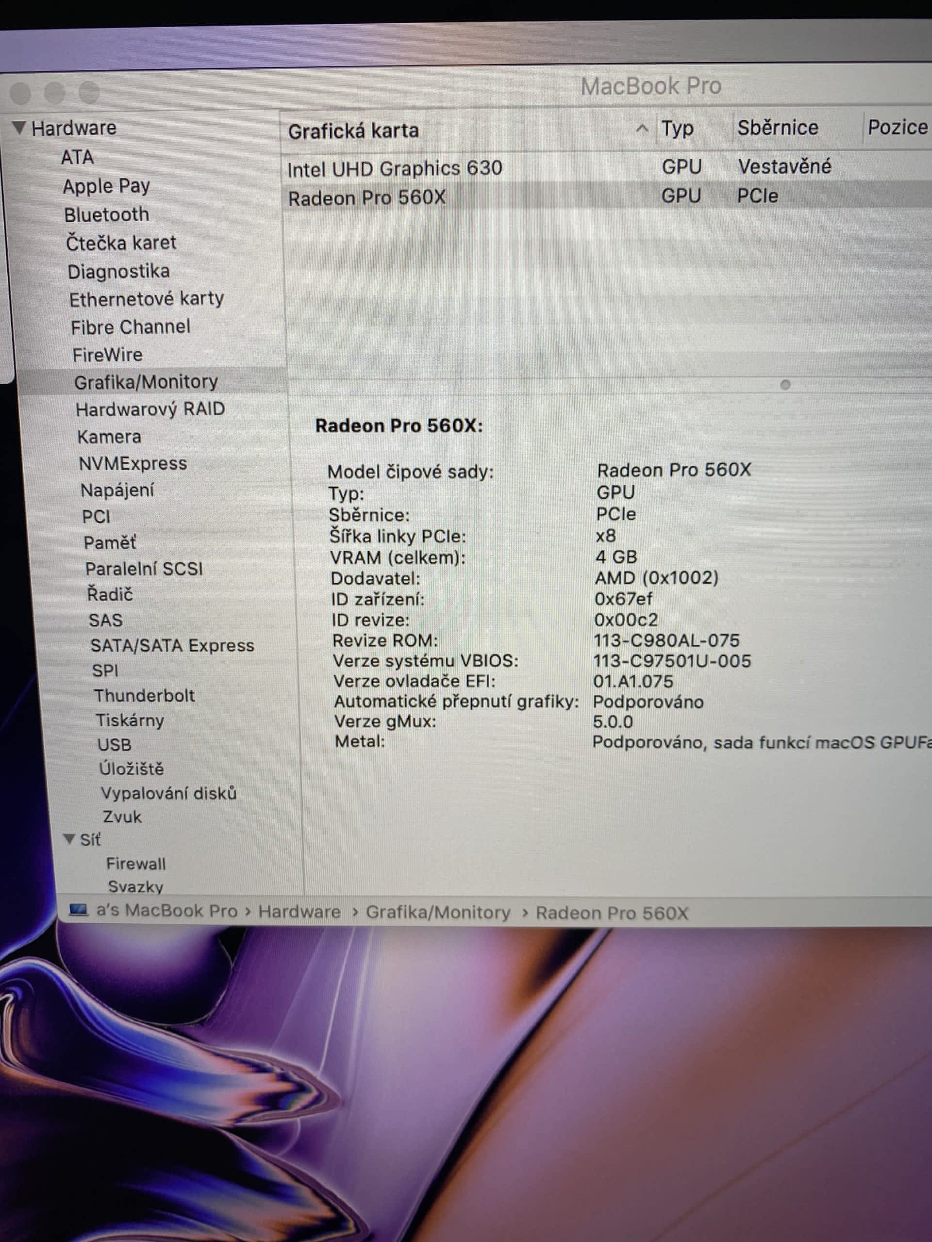 Grafické karty: UHD 630 (1536 MB) + Radeon Pro 560X (4GB)