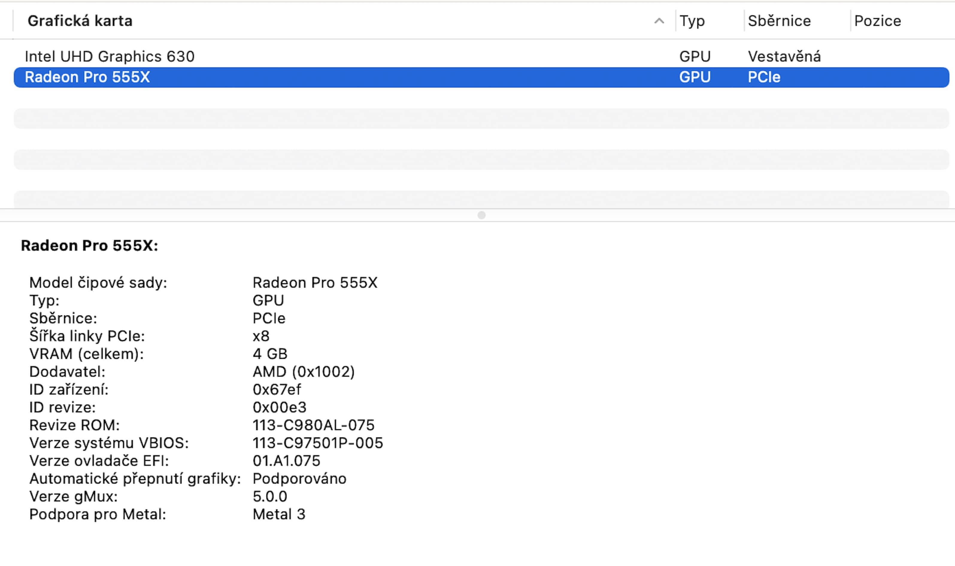 Grafická karta: Radeon Pro 555X 4GB,Intel HD Graphics 630 1536 MB