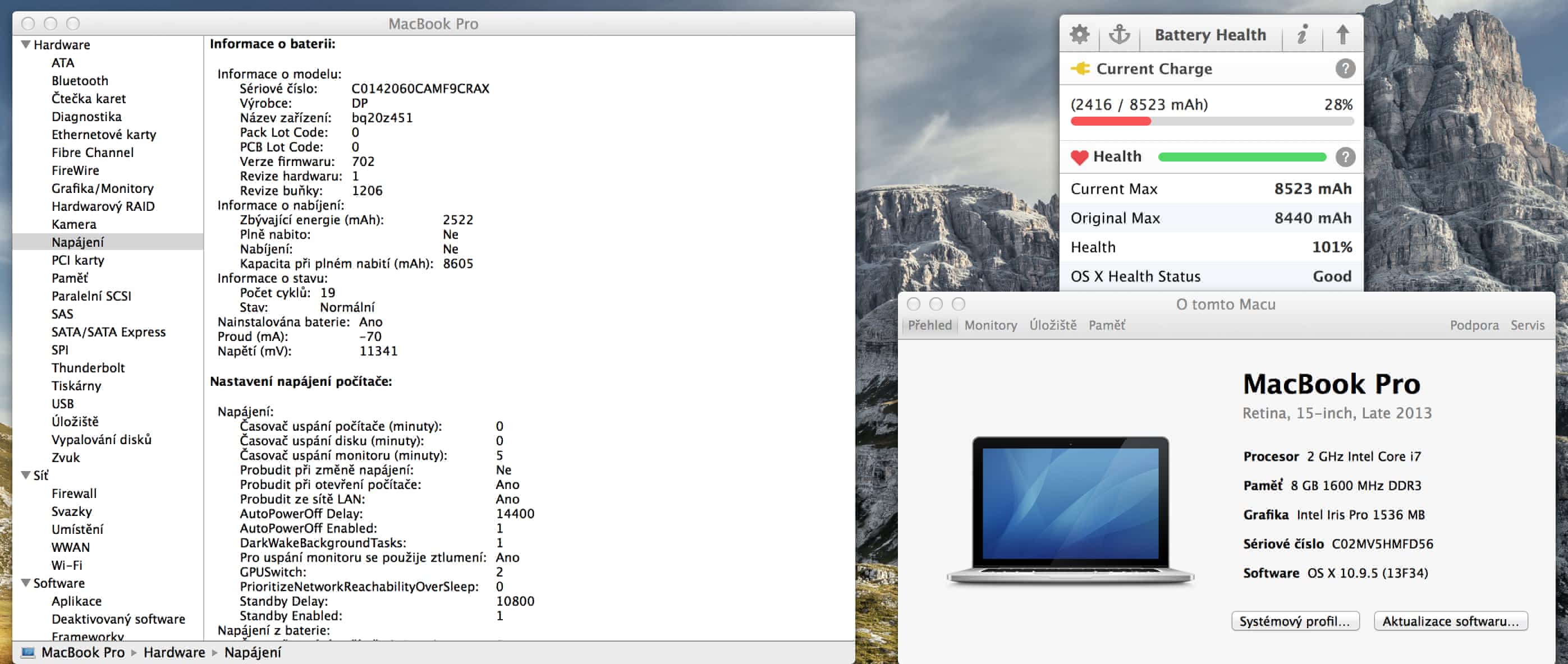 Stav Baterie: Perfektní 101% původní kapacity (8523 mAh z 8440 mAh uváděných výrobcem viz. fotogalerie screenshot Systémového profilu) s výdrží se dá dostat i přes 8 hodin uváděných Applem.