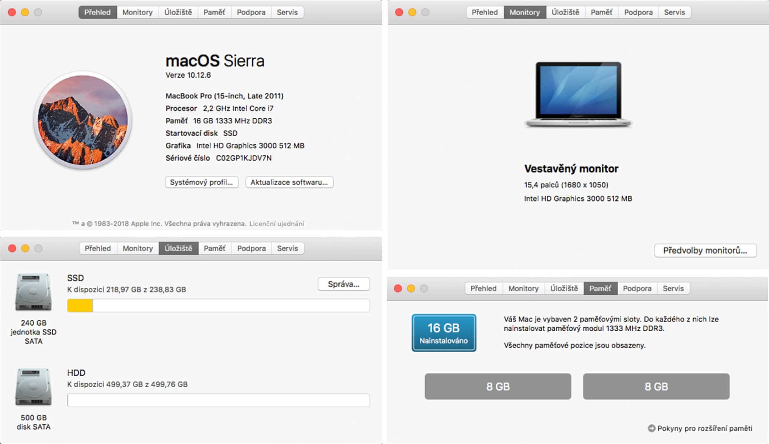 • Paměť: 16GB DDR3 SDRAM 1333 MHz (2x Corsair Mac Memory 8GB) – pořízeno v listopadu 2012