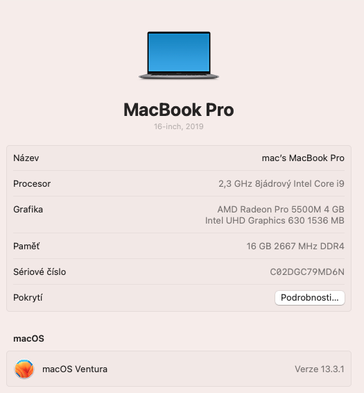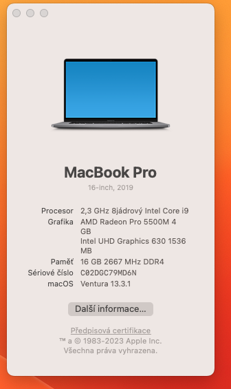 MacBook Pro 16'' 2019, 2.3 GHz i9 8-core, 16GB, 1TB, AMD Radeon Pro 5500M 4 GB