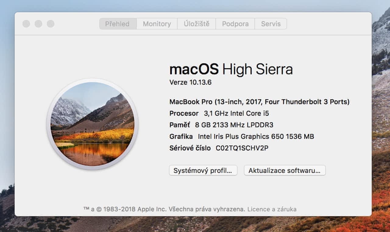 Nabízím MacBook Pro 2017 13" s Touch Barem, zakoupený u Alza.cz minulý rok v létě (ještě rok záruky). MacBook byl zakoupen za 62 000 Kč (nyní v doprodeji tento model stojí kolem 55 000 Kč). Jedná se o verzi s 512 GB SSD. Parametry: 3,1 GHz Intel Core i5, 8 GB RAM, Intel Iris Plus Graphics 1536 MB (viz foto). Celý rok byl nošen v neoprenovém obalu. který můžu přidat zdarma. Žádné velké oděrky ani škrábance na MacBooku nenajdete, jen drobné vlasečnicové škrábance z běžného používání, kterých si všimnete až po podrobném zkoumání. Důvod prodeje je zakoupení nové 15" verze. Mohu k MacBooku prodat i Magic Mouse 2, u které by bych se dohodl na ceně. MacBook nabízím s původní krabicí, napájecím adaptérem, samolepkami, návodem (stejně tak i Magic Mouse 2). Počet nabíjecích cyklů je 181.