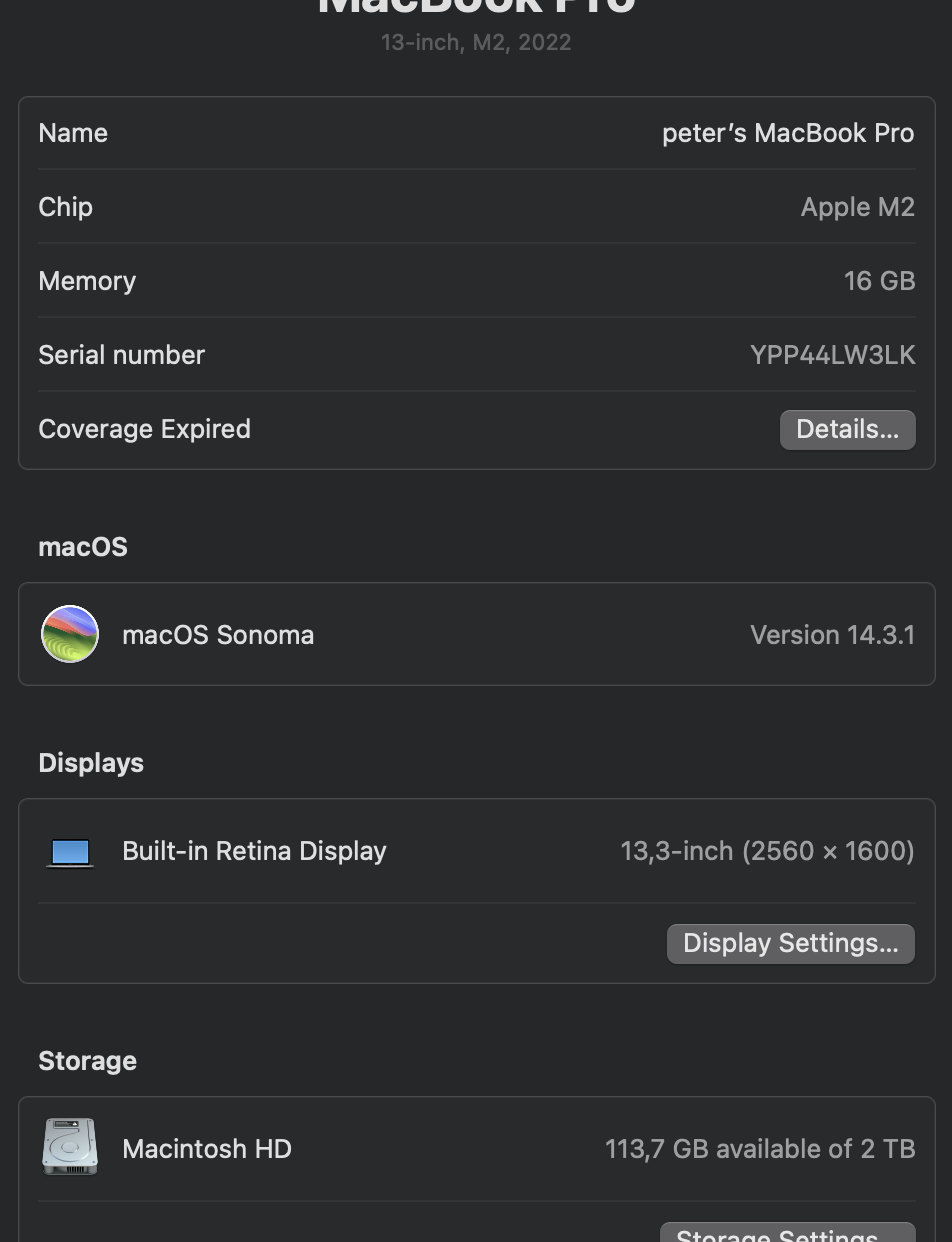 M2 (8jádrový), 13,3" IPS lesklý 2560 × 1600 px, RAM 16GB, Apple M2 10jádrová GPU, SSD 2000GB. LEN OSOBNE! Kupene v Alze 26. 11. 2022 (pc 60k), faktura k dispozicii, extra 1 rok zaruky (za 5k). Taska a usb dock k tomu. Celkovo vyborny stav, pouzivany len doma.