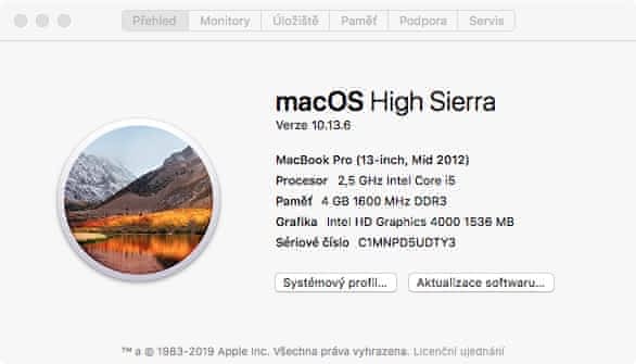 Do světa posílám opečovávaný Macbook Pro Mid 2012. Má vyměněný SSD 500Gb + mohu nechat instalovat i původní HDD 500Gb. Používaný pouze doma, jeden menší škrábaneček na víku (viz fotka). Na běžnou "kancelářskou" práci vydrží nabitý cca 5,5 hodiny, nabíječce chybí redukce A1561. Zájemci mohou před koupí vyzkoušet. Předám osobně v původní krabici.