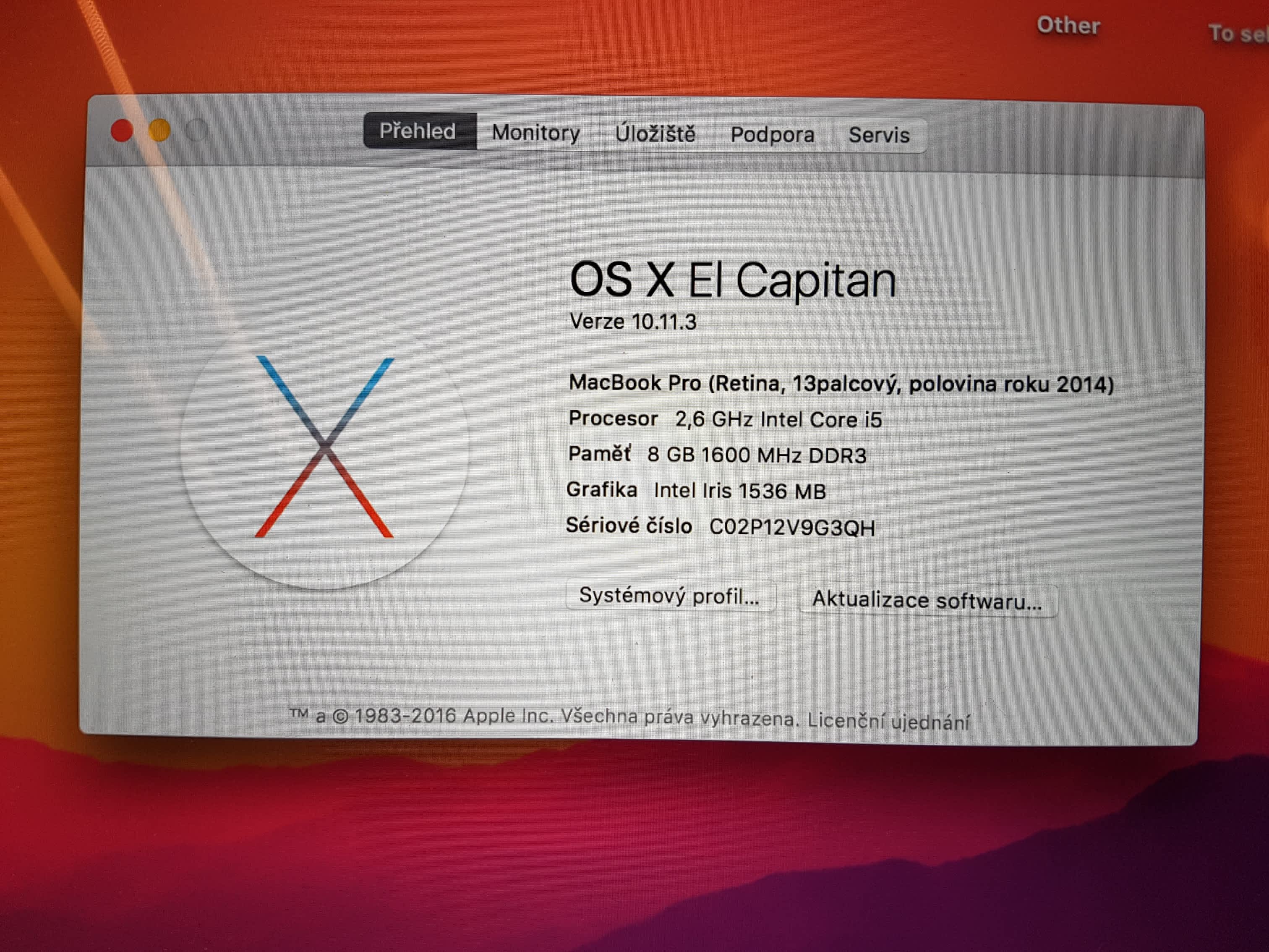 Zdravím, prodávám svůj Macbook Pro Retina 13" r. 2014, 2,6 GHz Intel Core i5, 8 GB 1600 MHz DDR3, Grafika Intel Iris 1536 MB, 128gb SSD, skvělý vizuelní stav, baterie 87,25% původni kapacity. Vše funguje krásně. QWERTY klávesnice, mám nalepená písmenka s diakritikou – kdo to neviděl, minimální rozdíl. Jen osobní převzetí Praha či Chomutov a okolí. Ať si můžete vše vyzkoušet. 🙂