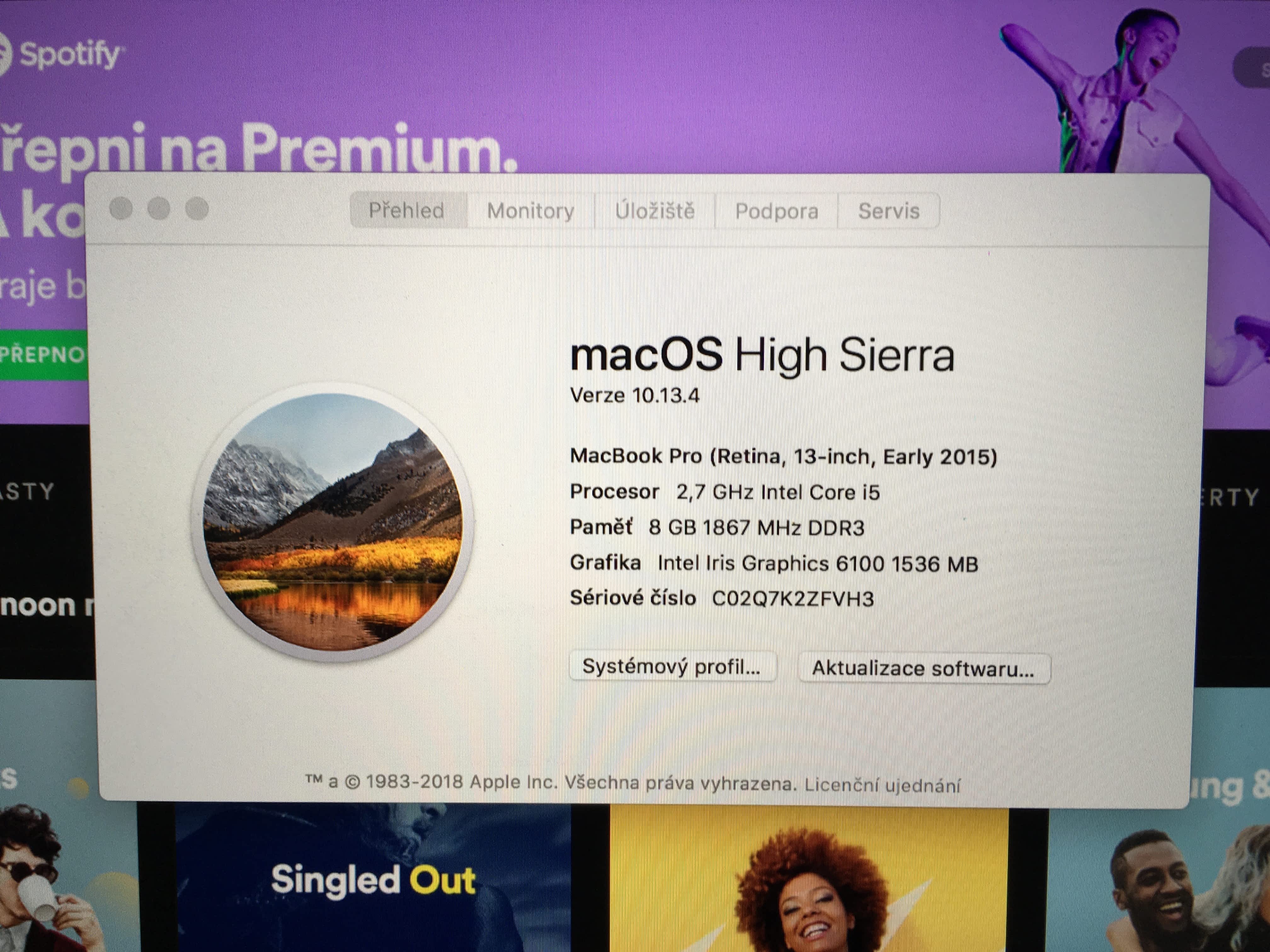 Prodávám MacBook Pro (Retina, 13-inch, Early 2015), procesor intel core i5, paměť 8GB, disk SSD 128GB. Notebook je koupený před 3 roky v Iwantu, kde byl zhuba po roce a pul používání vyměněn za nový, protože jsem na něj rozlil vodu. Měl jsem zaplacenou dvouletou záruku na "blbost", díky které jsem hned dostal nový kus. Notebook také nese pár šrámů a odřenin, z důsledků denního používání. Vše je 100% funkční.