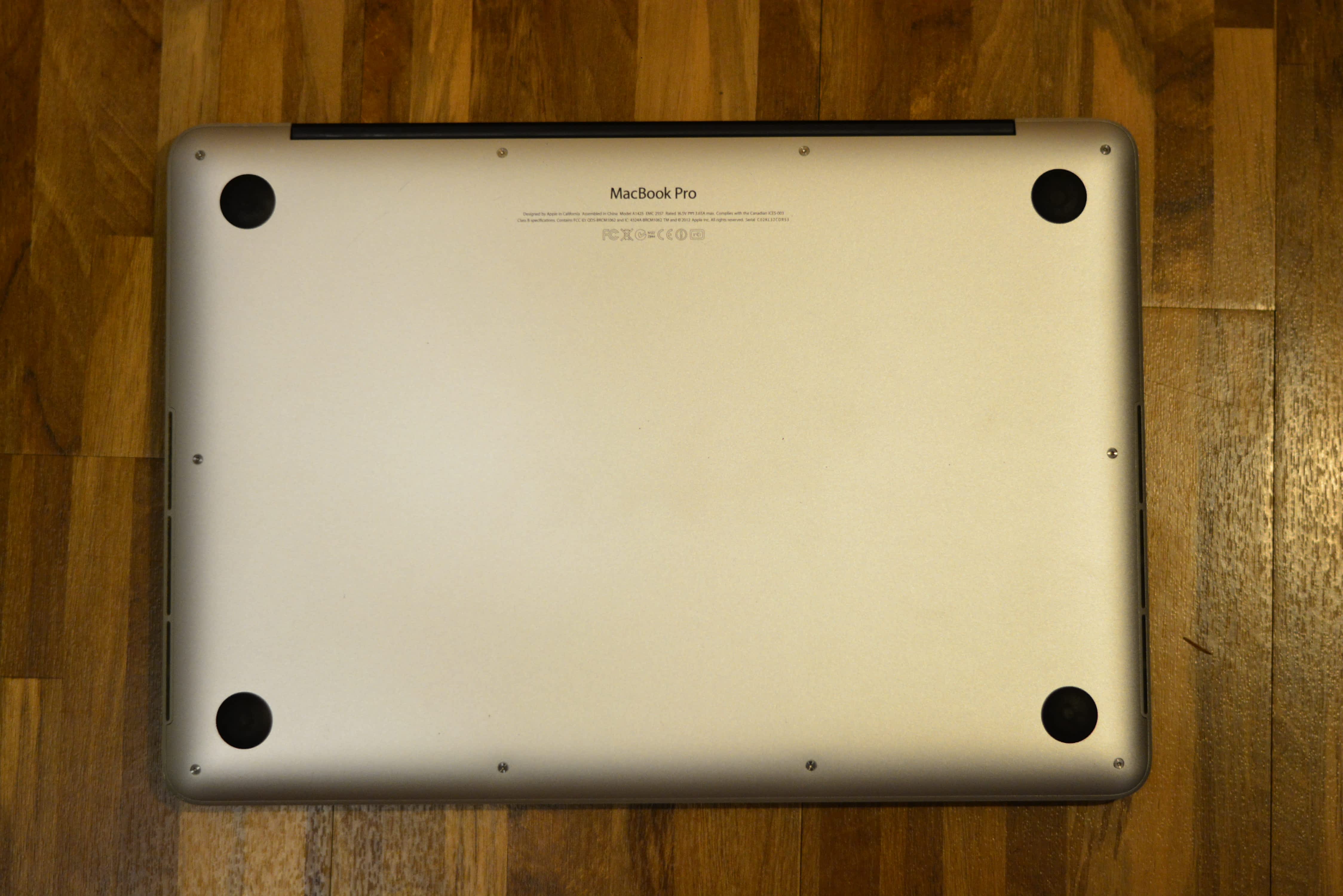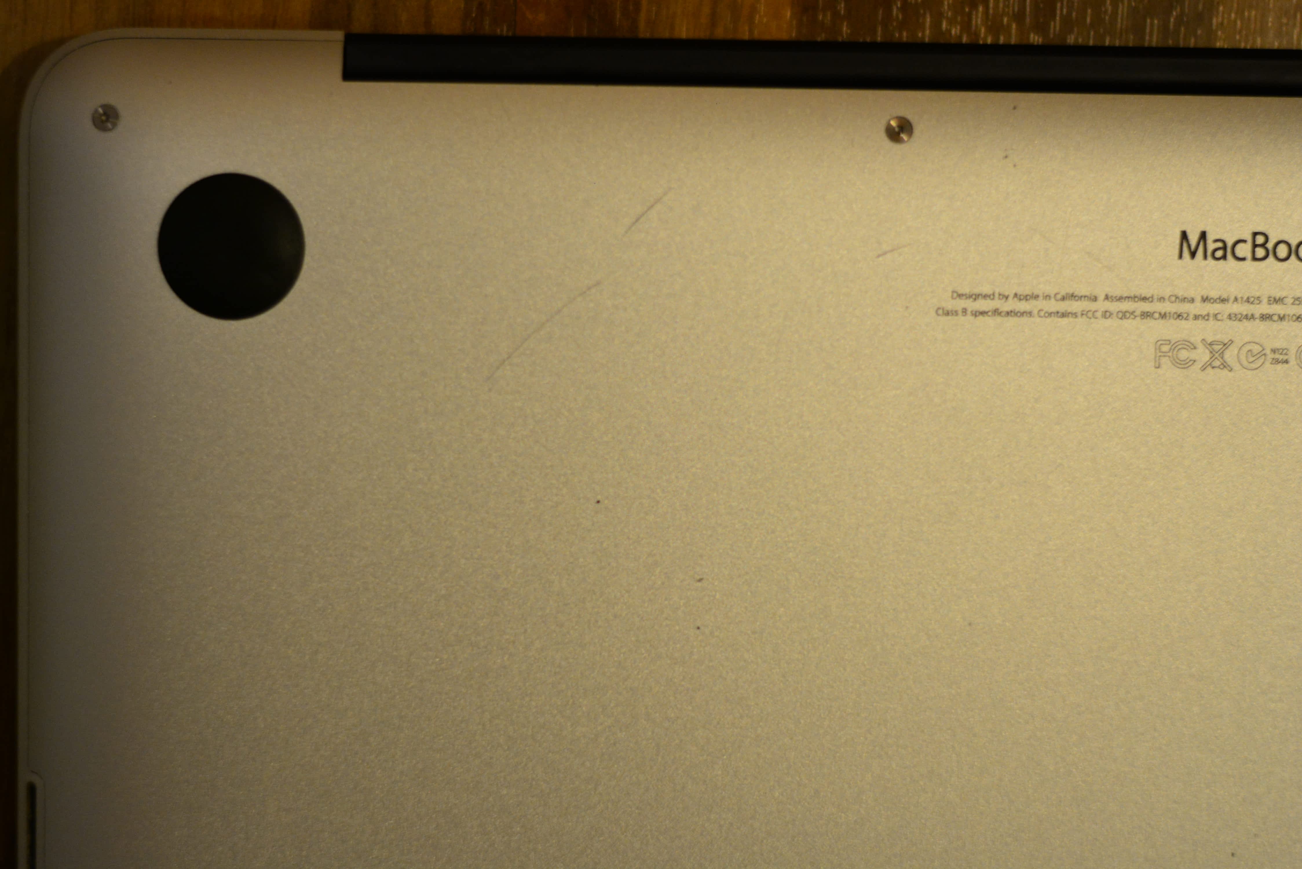 Příslušenství: dvakrát napájecí adaptér MagSafe (jednou krátký, jednou dlouhý), redukce MiniDisplayPort na VGA, DVI a HDMI + průhledný kryt na notebook. Počítač je v dobrém stavu, baterie 802 cyklů. Na zadní straně MacBooku je drobný škrábanec, viz fotografie.