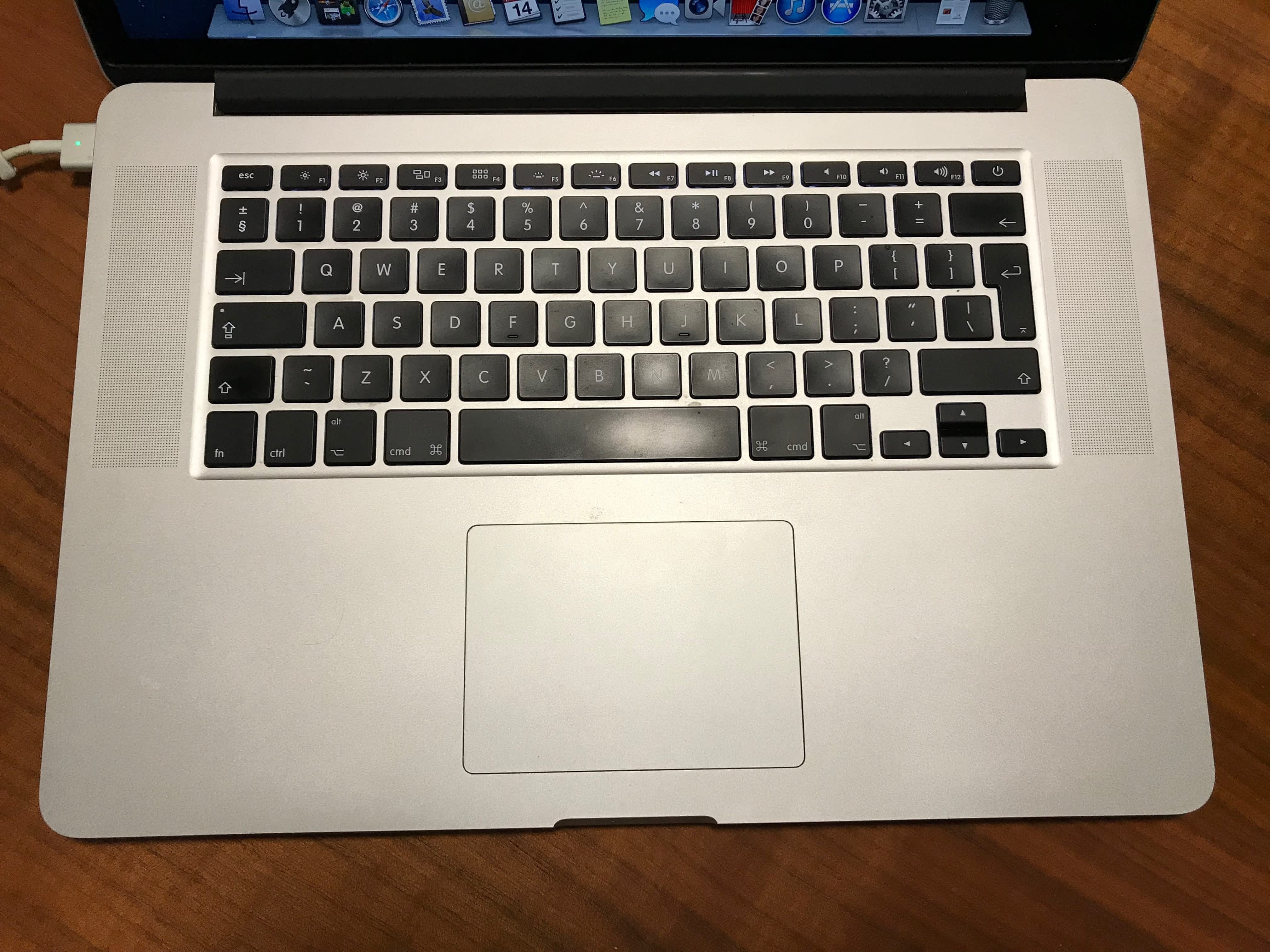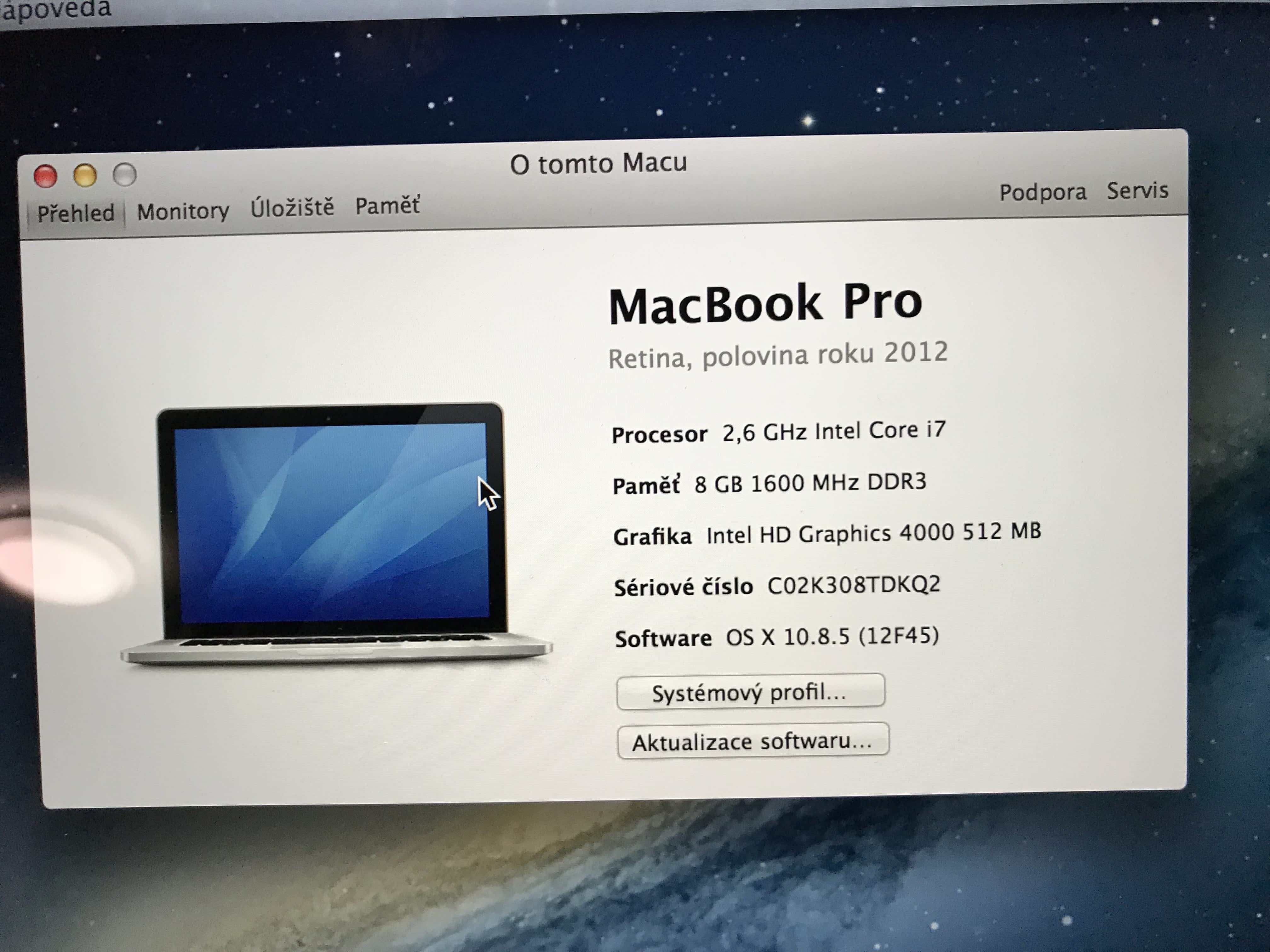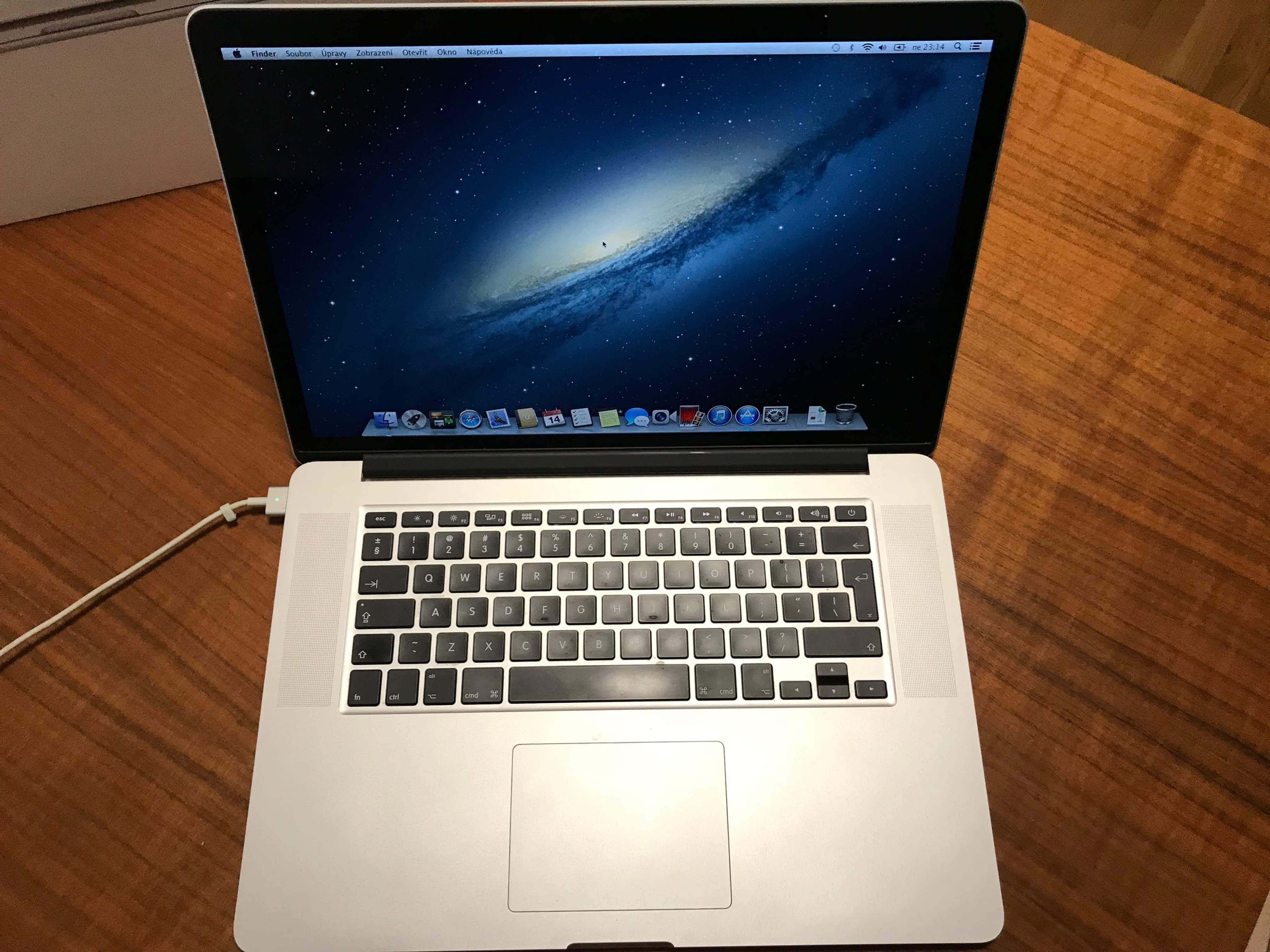 Macbook PRO Retina 15 Mild 2012, zakoupen v roce 2013 v září 2017 měněn display (ještě ochraná známka na jablku), v říjnu odešel SSD disk původně 512GB – vyměněn za 240GB (leden 2018). V září notebook kompletně vyčištěn v servisu, měněn displej a zkontrolována grafická karta).