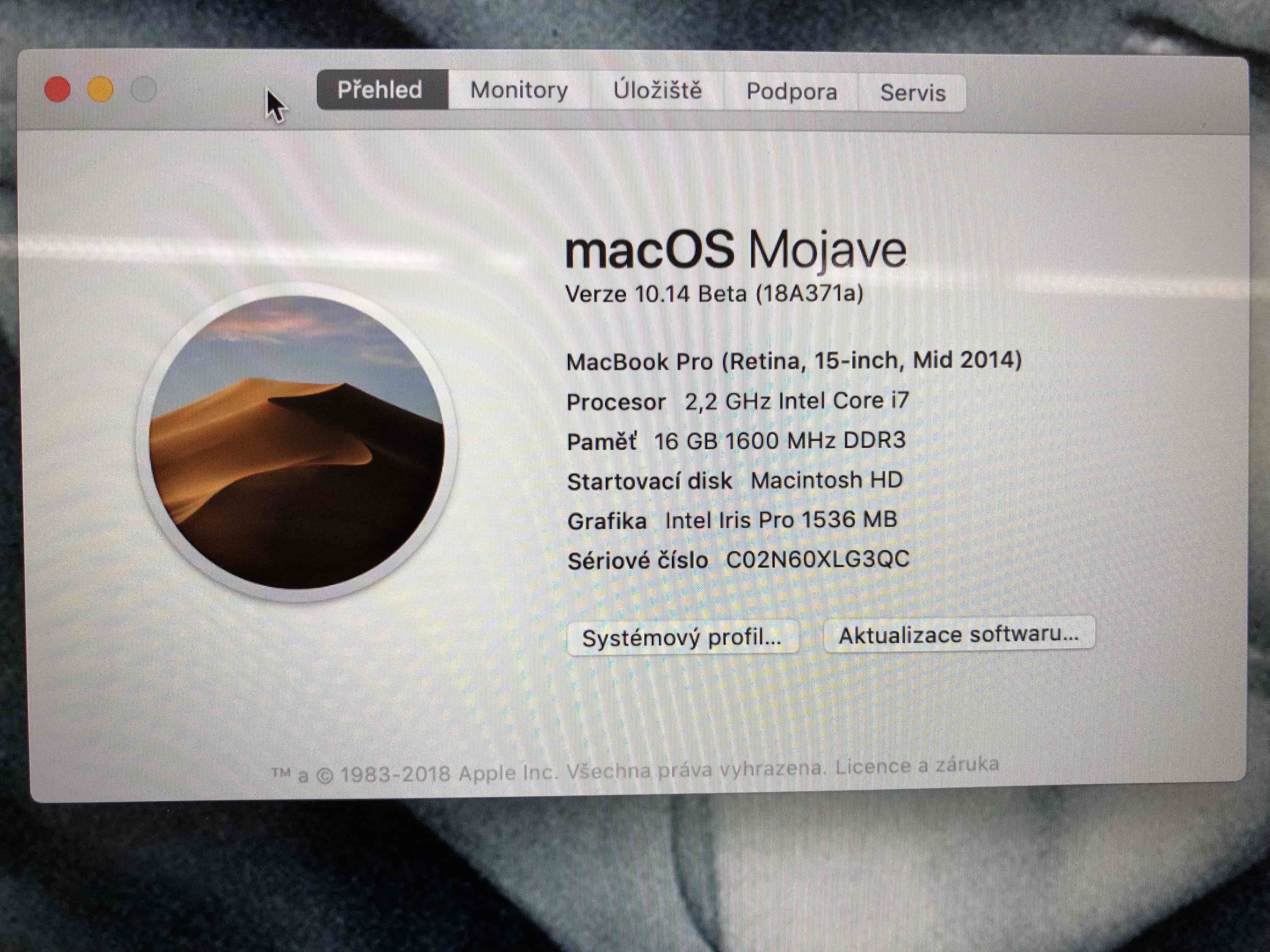 Prodám zánovní MacBook pro, kupovaný v roce 2014. Ve skvělém stavu – pouze nepatrné oděrky na hranách Macu, ale rohy jsou čisté – 93% Baterka už má nejlepší za sebou (1400cyklů) a nejspíš bude časem nutná výměna. Jinak vše funguje, jak má a mac v pohodě vydrží několik hodin bez nabíječky. Prodávám jej, protože si chci koupit výkonnější variantu.