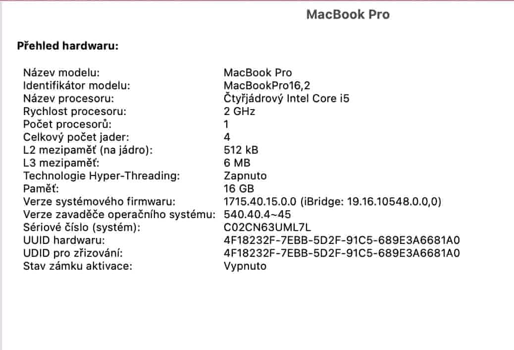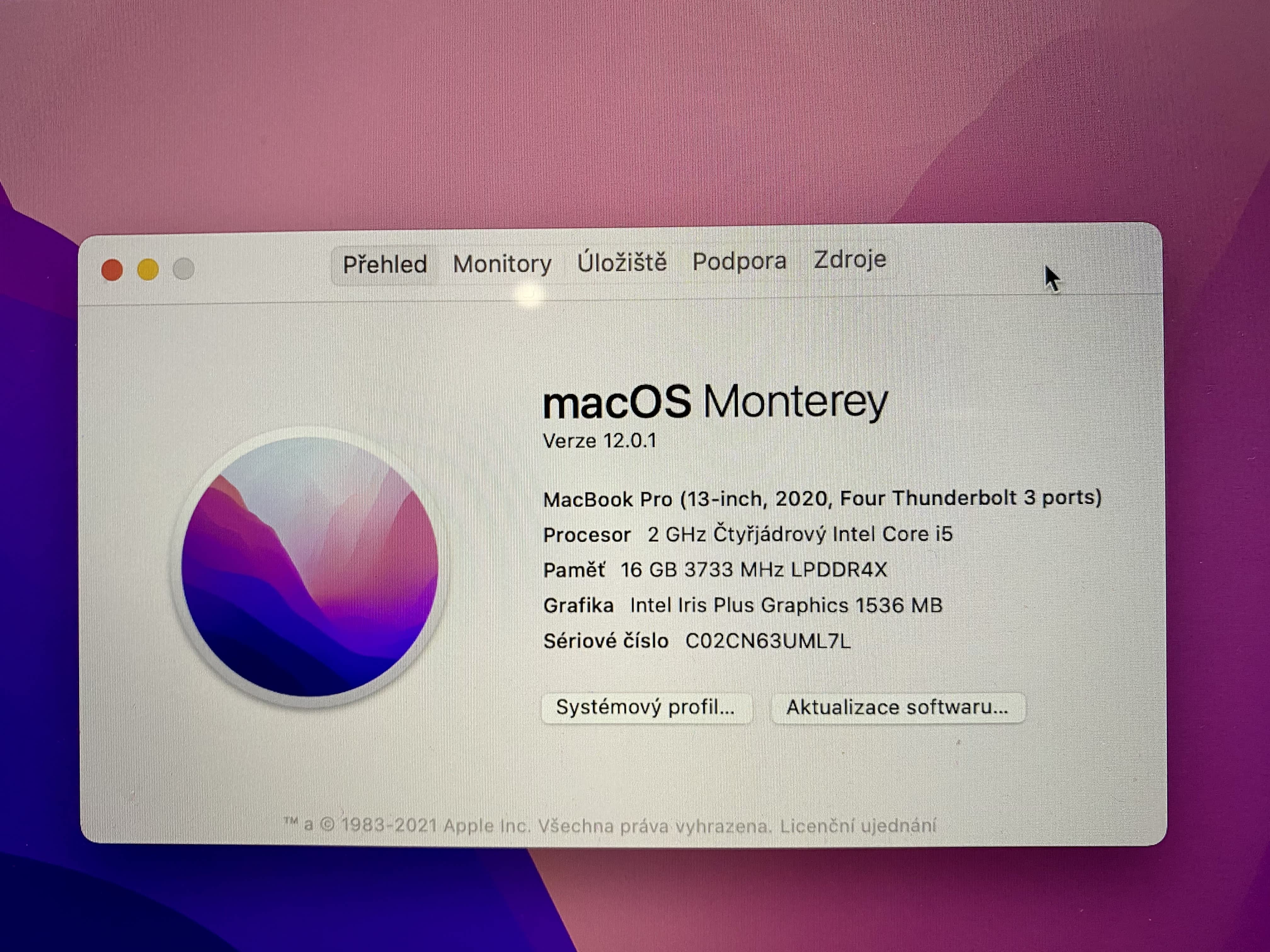 PRODÁM 13″ MacBook Pro 2020, 4jádrové Intel Core i5, Intel Iris Plus Graphics, 16 GB RAM , 512 GB SSD, stříbrný se čtyřmi porty Thunderbolt 3. Bez jakéhokoliv vnějšího poškození. Displej je jako nový bez jediného škrábance. Krabice včetně nabíjení je součástí. Původní cena 55 450 Kč, PRODEJNÍ CENA je 38 500 Kč, při rychlém jednání jsem ochoten slevit. Prodej výhradně osobně po domluvě – MacBook je vymazán/odhlášen, nicméně bez přihlášení zprovozněn pro vyzkoušení a ověření.