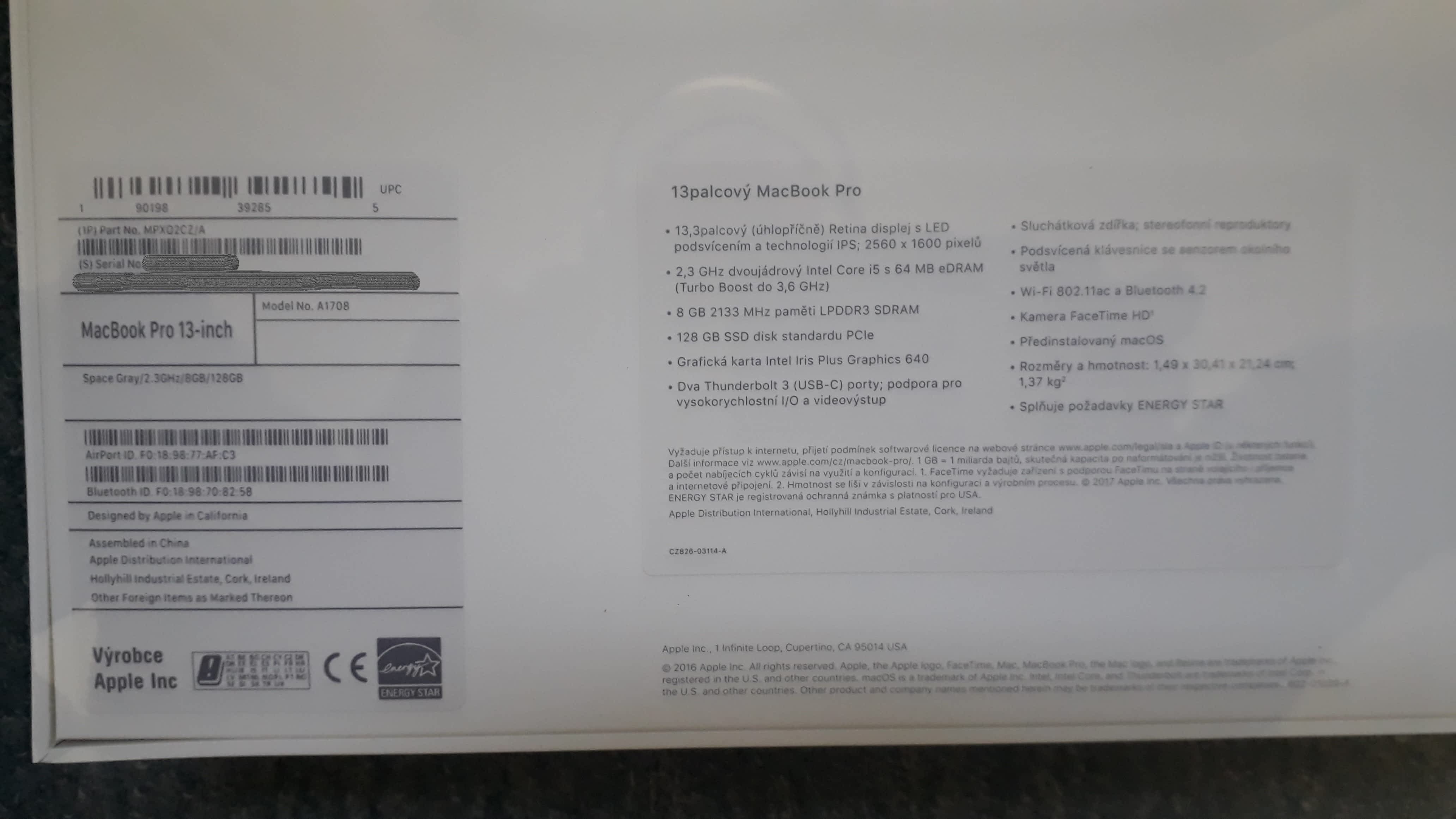 uplne novy, jeste nerozbaleny MacBook – Intel Core i5 2.3 GHz Kaby Lake, 13.3" IPS LED 2560×1600 Retina, RAM 8GB LPDDR3, Intel Iris Plus Graphics 640, SSD 128GB, WiFi 802.11ac, Bluetooth 4.2, Webkamera Facetime 720p, 2x USB-C Thunderbolt 3, Force Touch Trackpad, podsvícená klávesnice, predinstalovany macOS. V pripade zajmu poskytnu SN k overeni zaruky. Cena k jednani