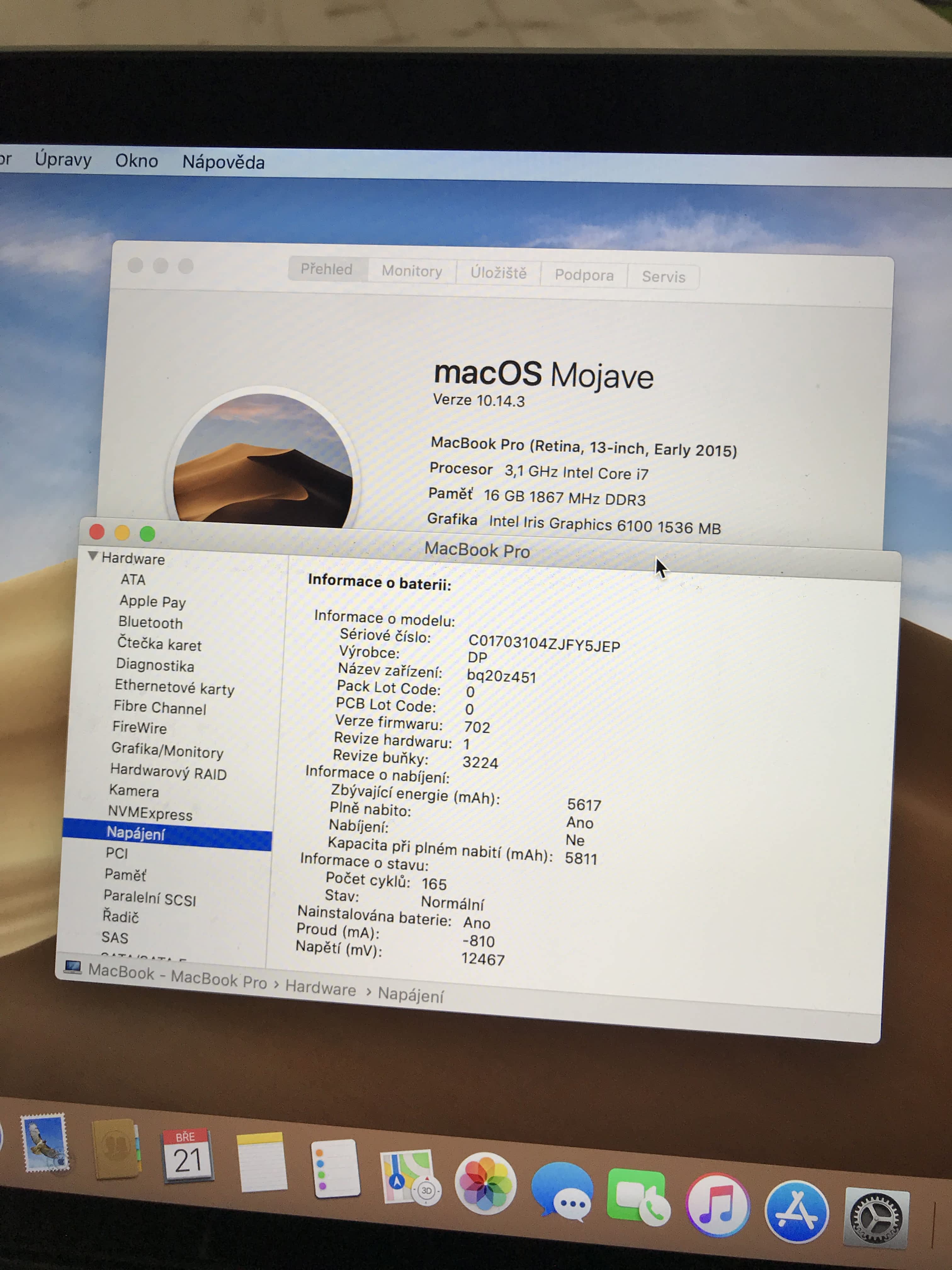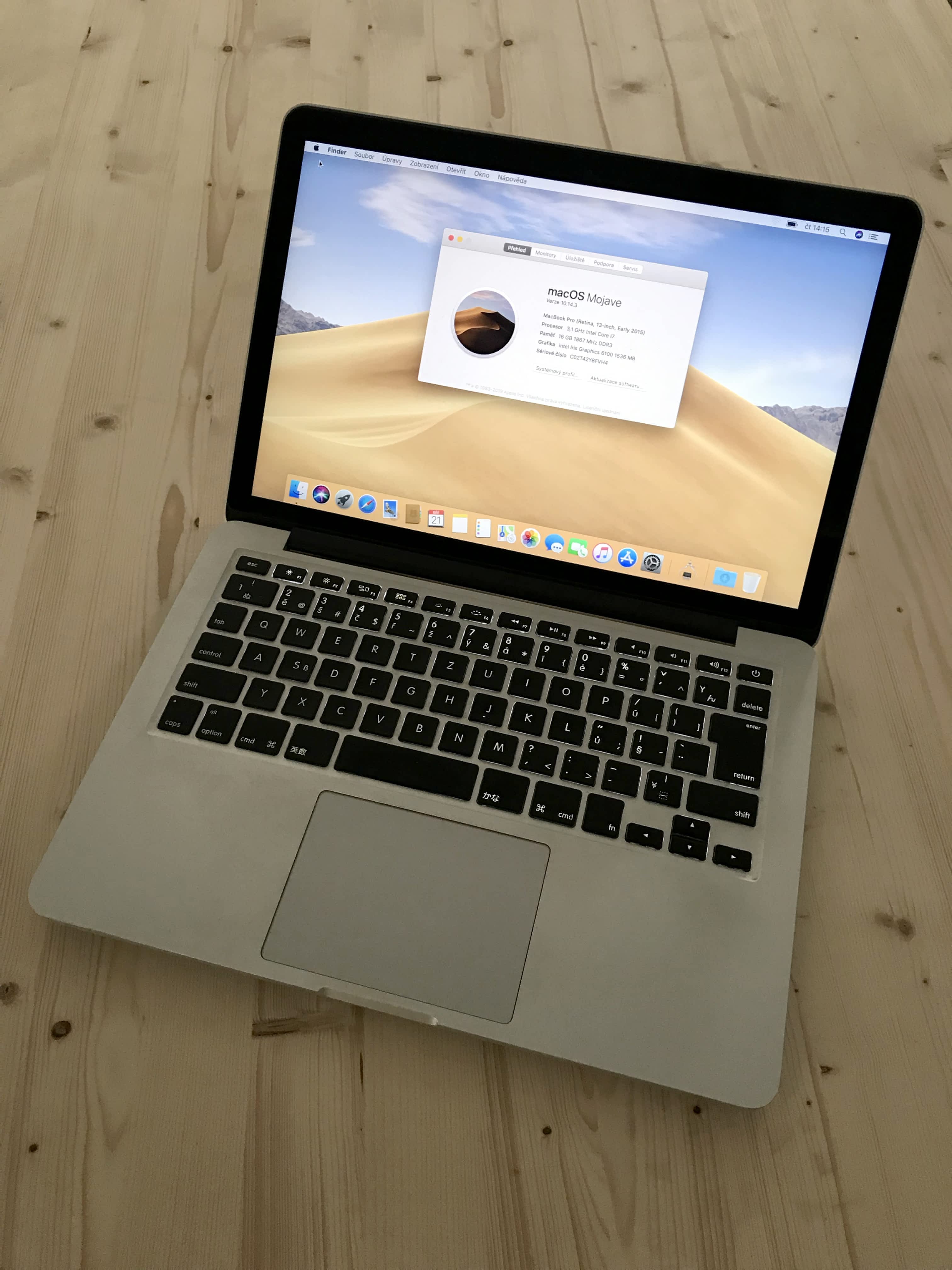 Prodám MacBook Pro 13" Retina (Early 2015). CPU i7 3,1 GHz, 16 GB RAM, 500 GB SSD. Magsafe2 (+ nabíječka), 2x USB 3 (5 Gbps), 2x Thunderbolt 2 (20 Gbps), HDMI, čtečka karet. Mac OS Mojave 10.14.3. Notebook je plně funkční, včetně baterie (165 cyků), využíván doma a na cestách ke zpracování fotek. Opotřebení odpovídá charakteru využívání a stáří NB.