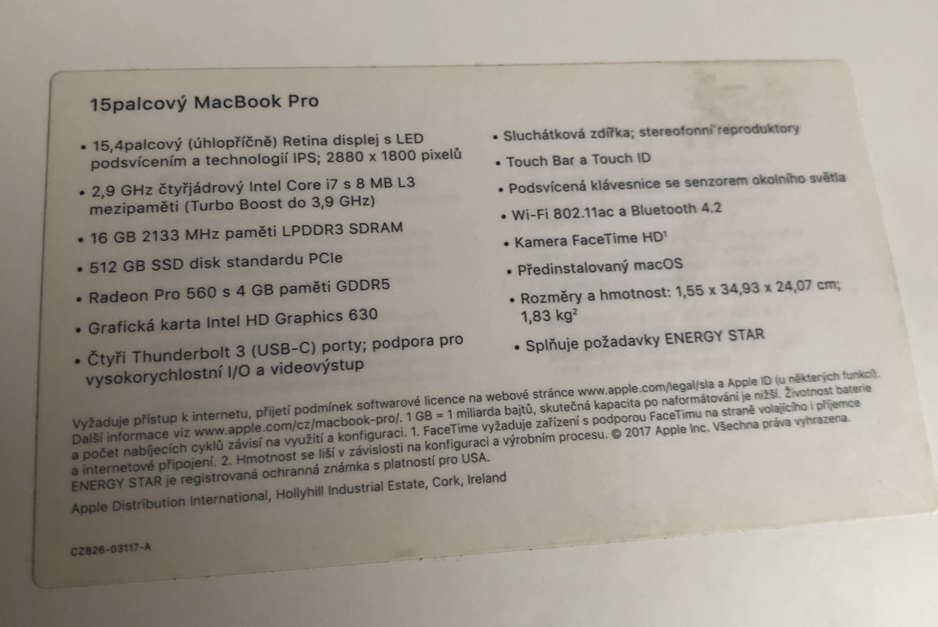 Notebook bol kupovaný v HonKongu 10/2018 spolu s AppeCare+ planom na 2 roky,