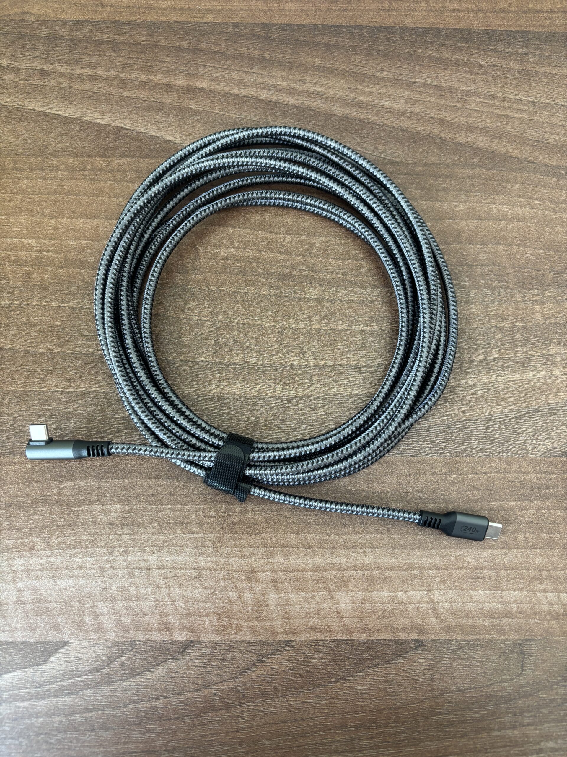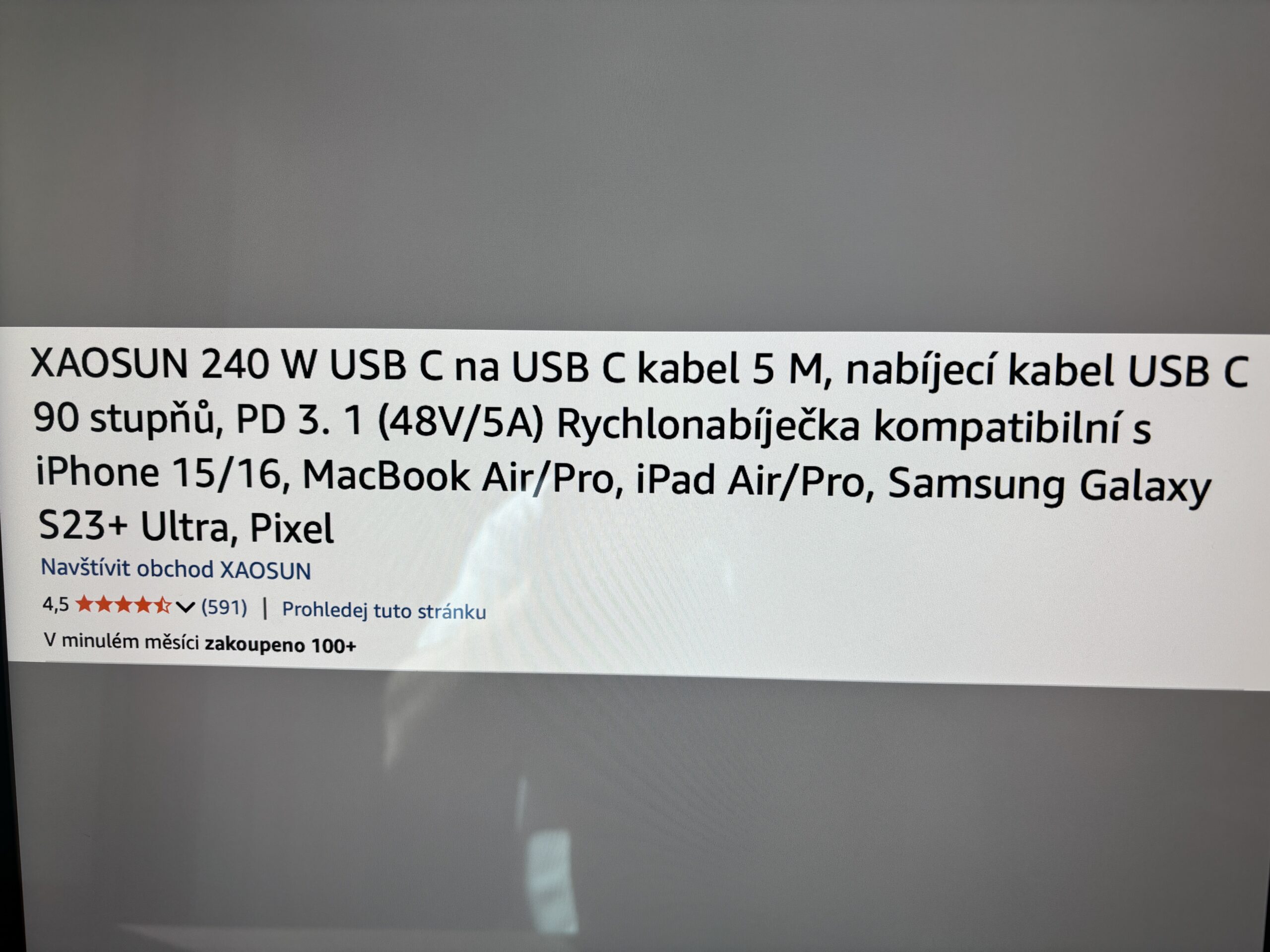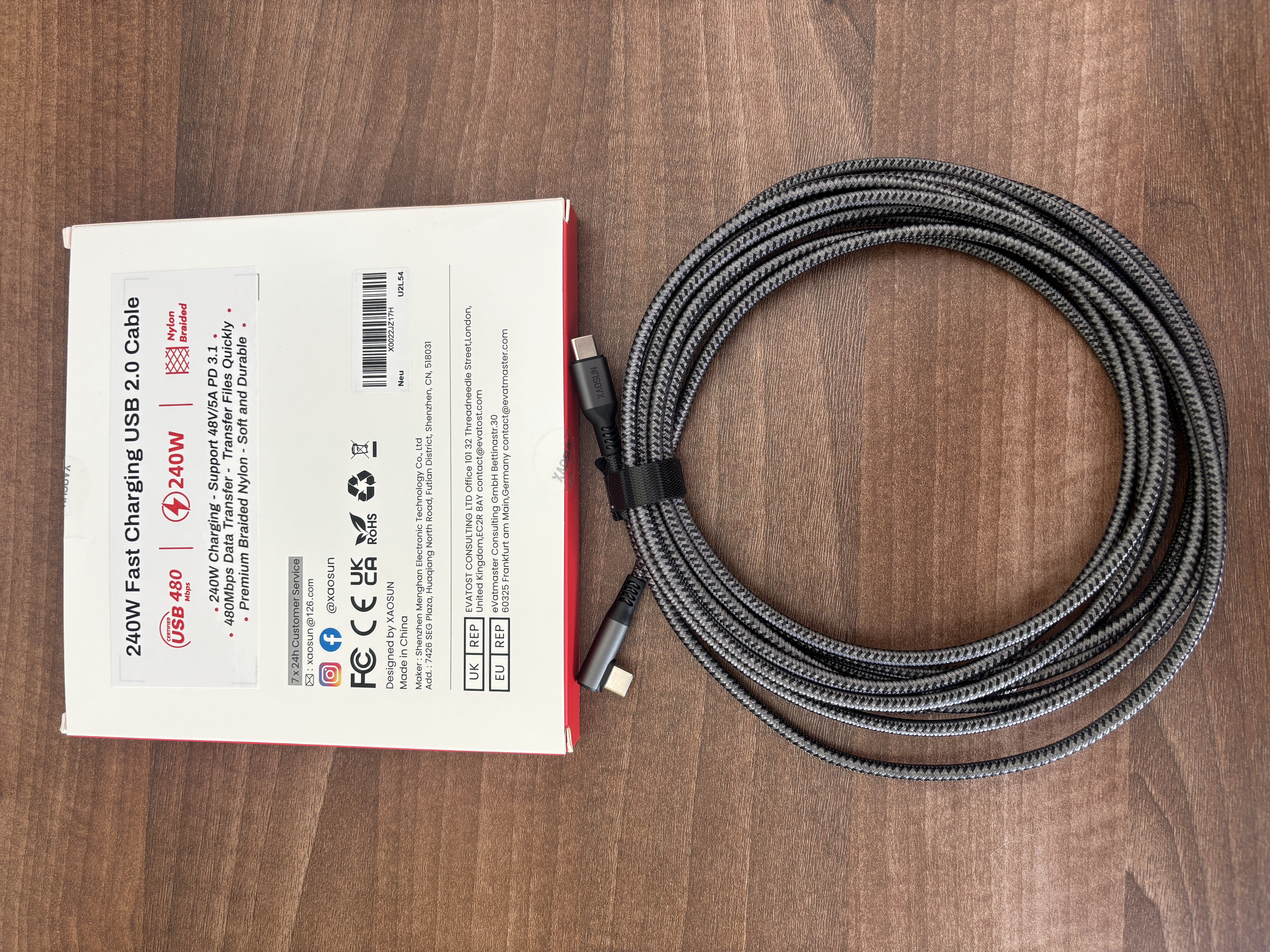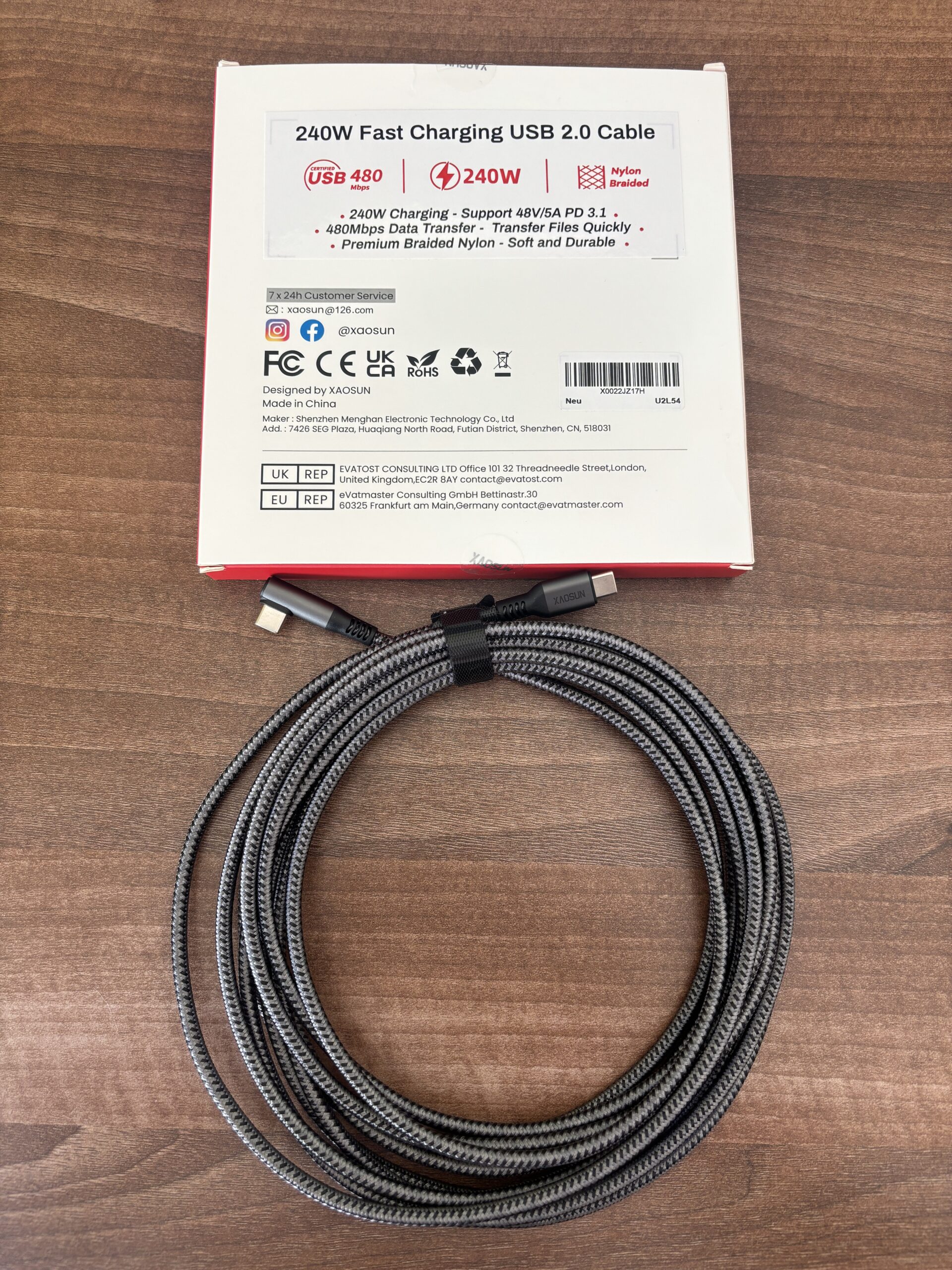 Prodám cca 3x použitý nabíjecí a datový kabel XAOSUN 240 W USB C na USB C kabel 5 M, nabíjecí kabel USB C 90 stupňů, PD 3. 1 (48V/5A) Rychlonabíječka kompatibilní s iPhone 15/16, MacBook Air/Pro, iPad Air/Pro, Samsung Galaxy S23+ Ultra, Pixel bezpečnostní čip E-Marker 2.0
