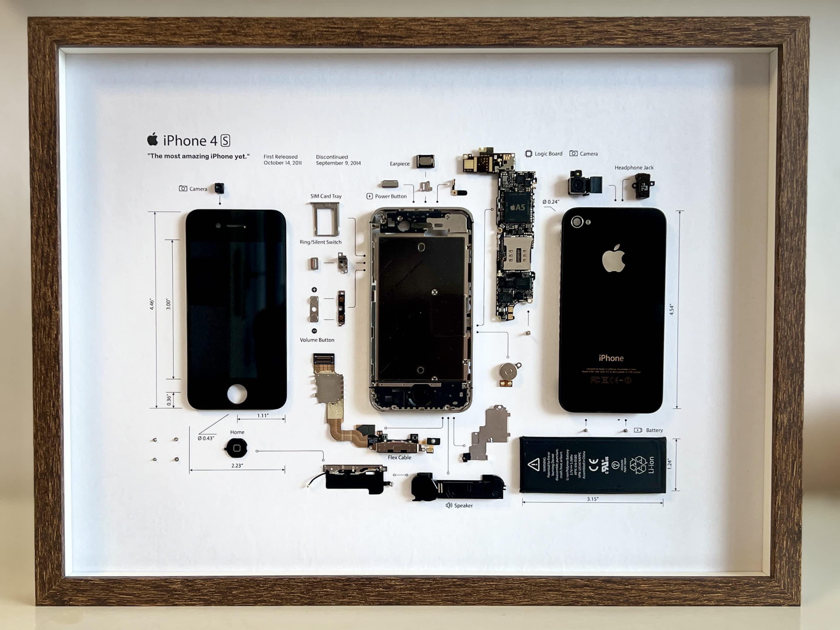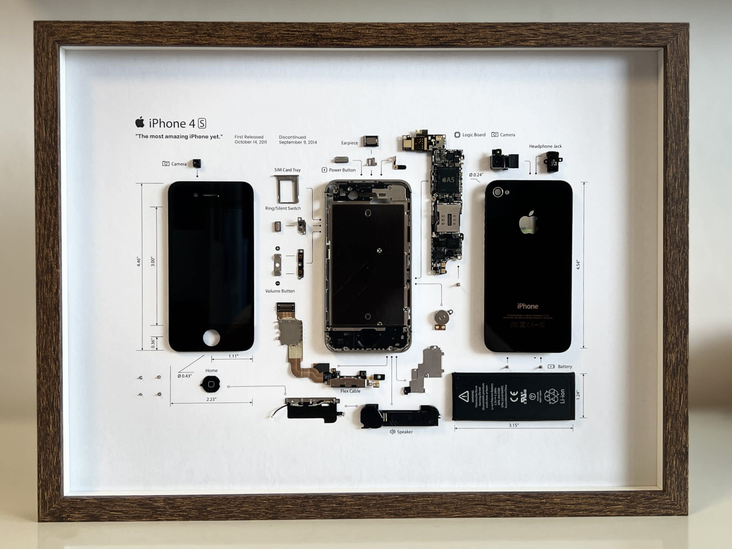 Zarámovaný obraz z iPhone sestavený z jeho součástí a s popisem jednotlivých součástek. Jedná se o pěknou dekoraci pro fanoušky značky Apple. Rám 30×40 cm .Fotografie jsou foceny u každého kusu zvlášť, tedy vidíte co opravdu kupujete.