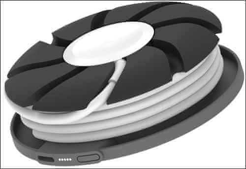 Dobíjecí stanice pro Apple Watch, vnitřní kapacita 1800mAh, stočení kabelu pro nabíjení uvnitř docku a magnetů bude vše pevně usazeno, vyrobeno z hliníku a plastu, výstup 5V/1A, microUSB vstup, průměr 72mm, výška 25mm, balení neobsahuje dobíjecí kabel.
