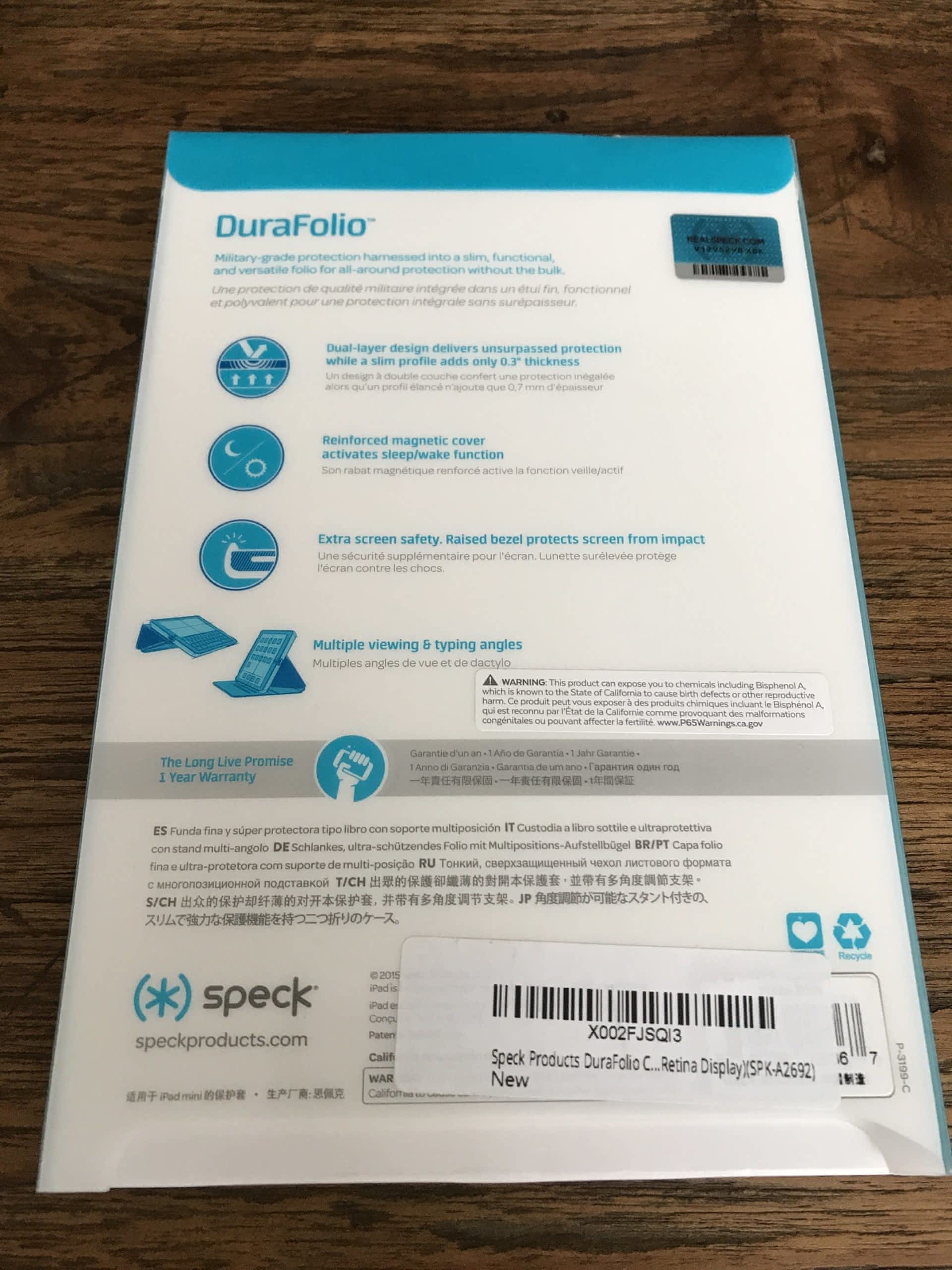Nové nepoužité Pouzdro Speck DuraFolio Case pro iPad mini 1,2,3 (není určeno pro iPad mini 4). Velmi pevná ochrana celého iPadu, magnetické probuzení/uspání přístroje, funguje také jako stojánek.