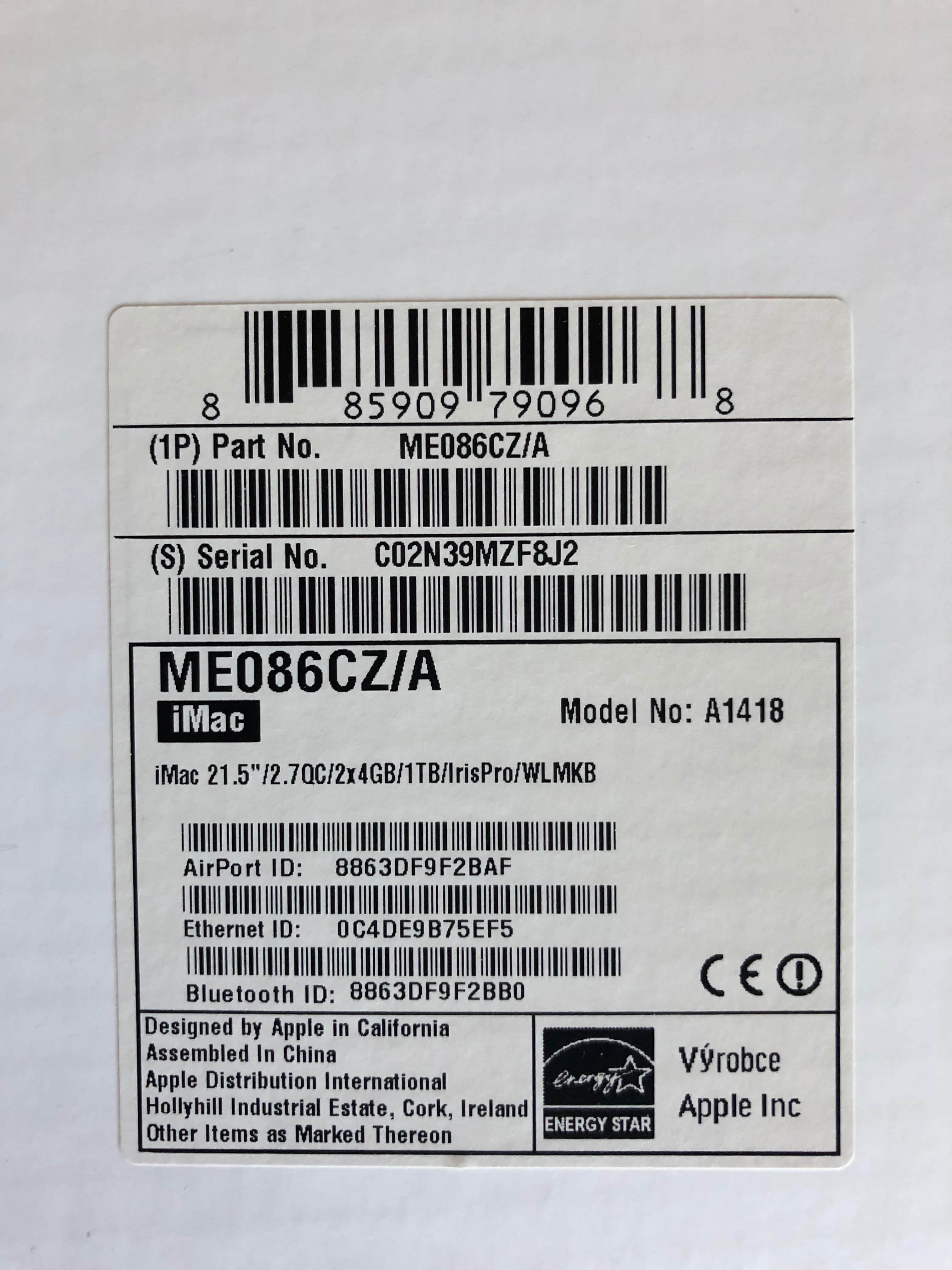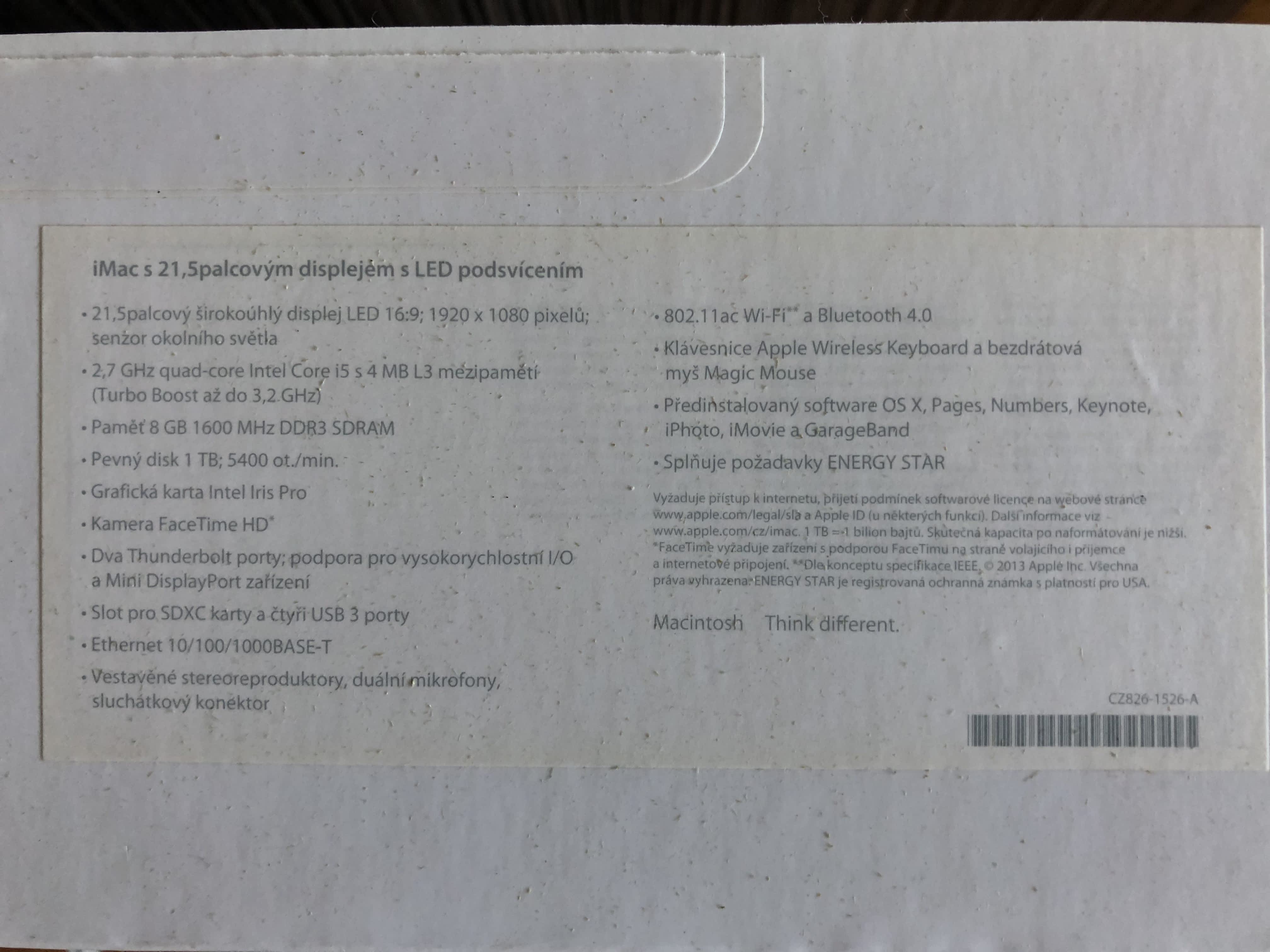 All in one počítač s LED displejem velikosti 21.5", Full HD rozlišení 1920 × 1080 bodů, senzor okolního světla, čtyřjádrový procesor Intel Core i5 (4M Cache, 2.7 GHz, 3.2 GHz Turbo), 8 GB operační paměti DDR3, grafická karta Intel Iris Pro, pevný disk s kapacitou 1 TB, WiFi, Bluetooth 4.0, FaceTime HD webkamera, reproduktory, 2x Thunderbolt, 4x USB 3.0, myš Magic Mouse + Apple bezdrátová klávesnice + USB hub Belkin.