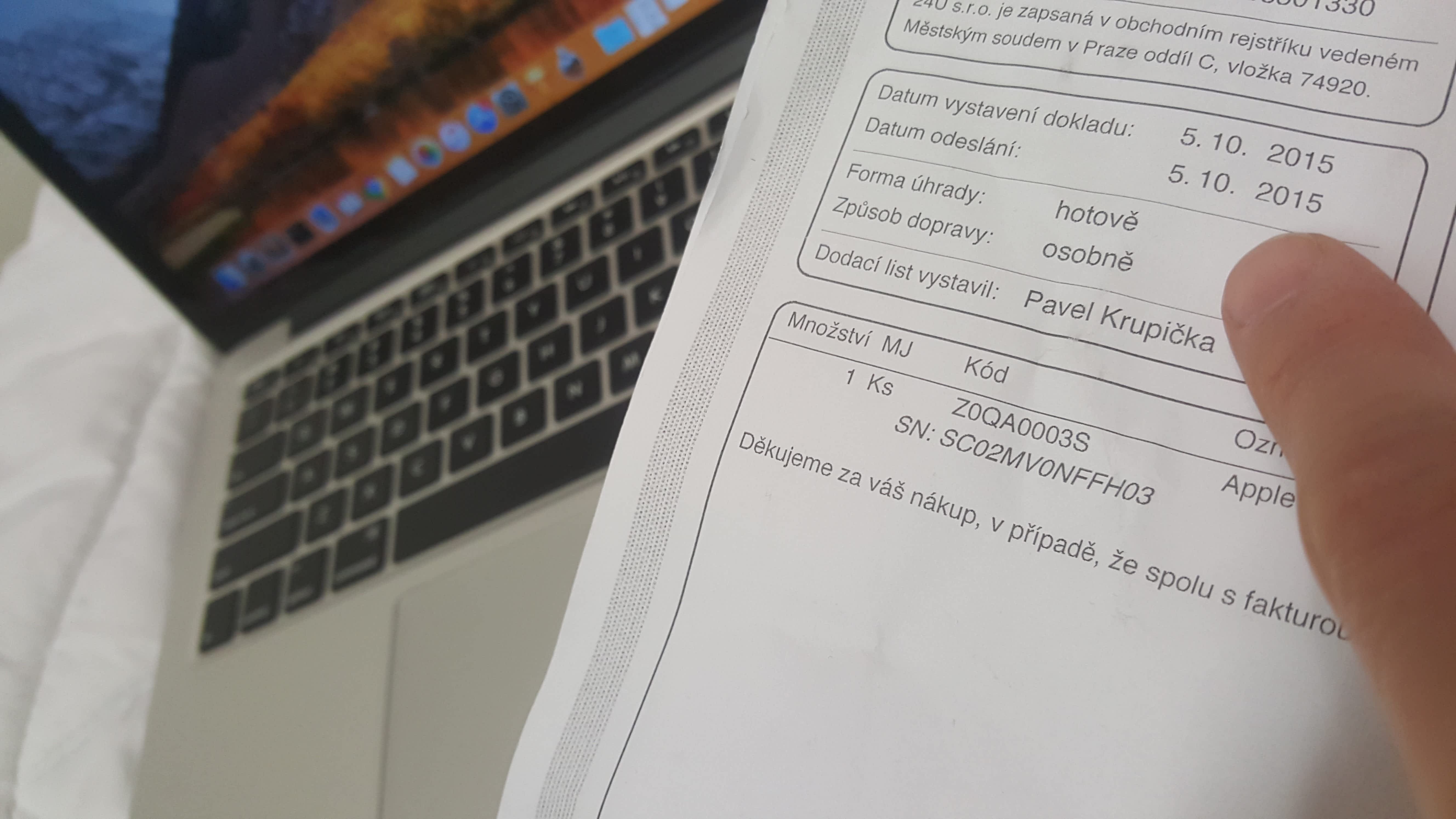MacBook byl zakoupen v ČR v říjnu roku 2015, se zárukou 2 roky. Ta tedy vypršela ani ne před měsícem. Nikdy nebyl problém a tedy nebylo nic reklamováno. Nyní prodávám z důvodu koupě novějšího modelu.