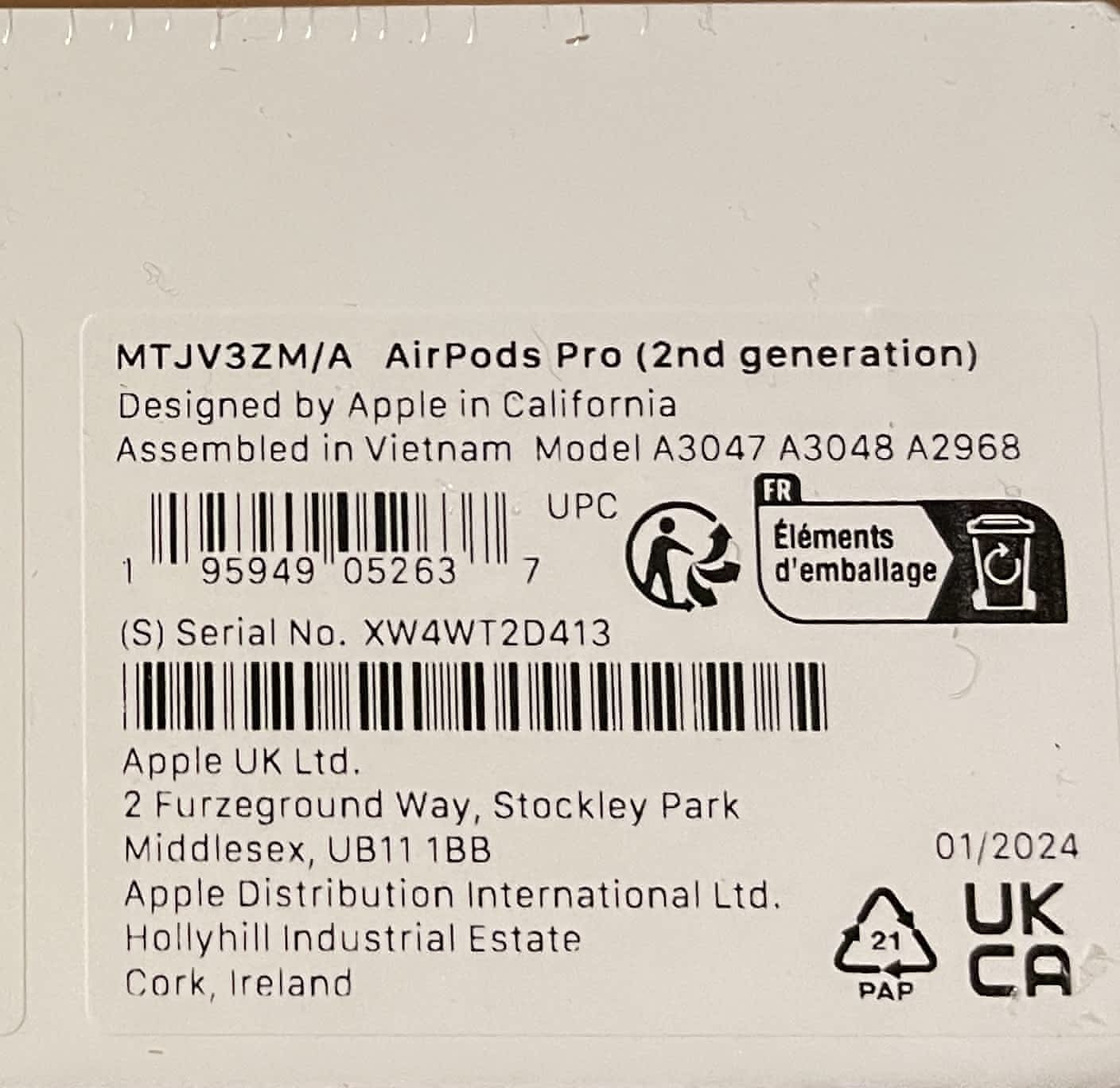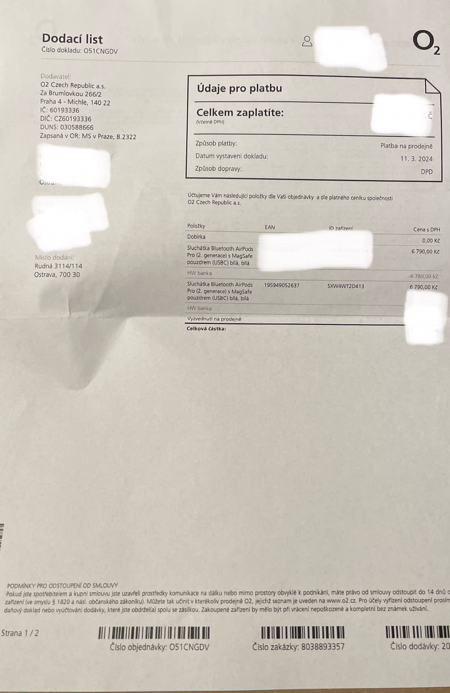 Prodám zcela nové zafoliované AirPods Pro 2 s MagSafe, serial No. SXW4WT2D413, zakoupené v rámci HW banky 11/3/2024 v O2 prodejně v Ostravě = klasická záruka tj. ke sluchátkům přiložím kopii kupního dokladu = záručáku s výše uvedeným dnem koupě. Nejlépe osobní předání v Ostravě/FM/Hav, nebo můžu zaslat po předchozí platbě = cena plus 80 kč.