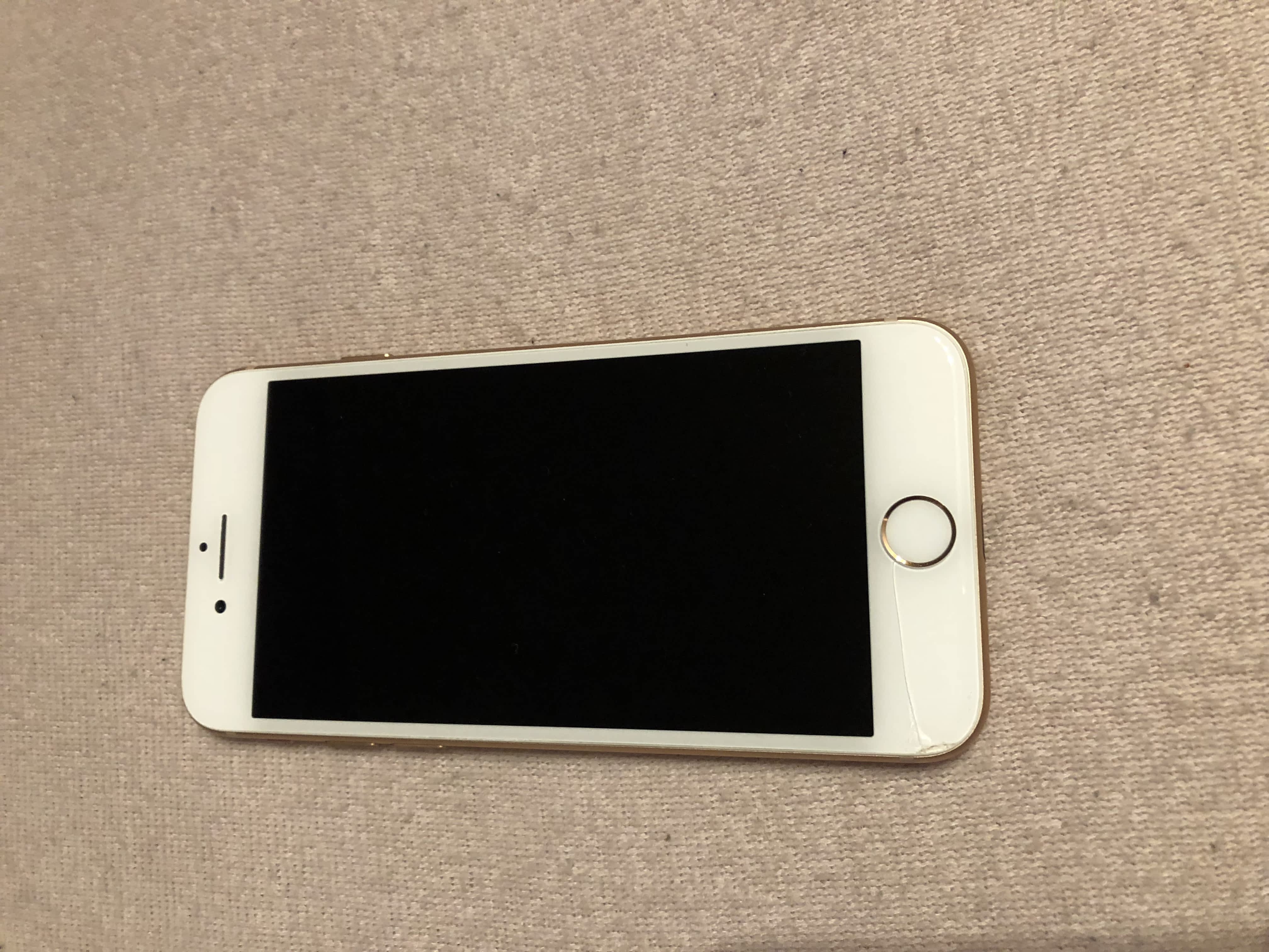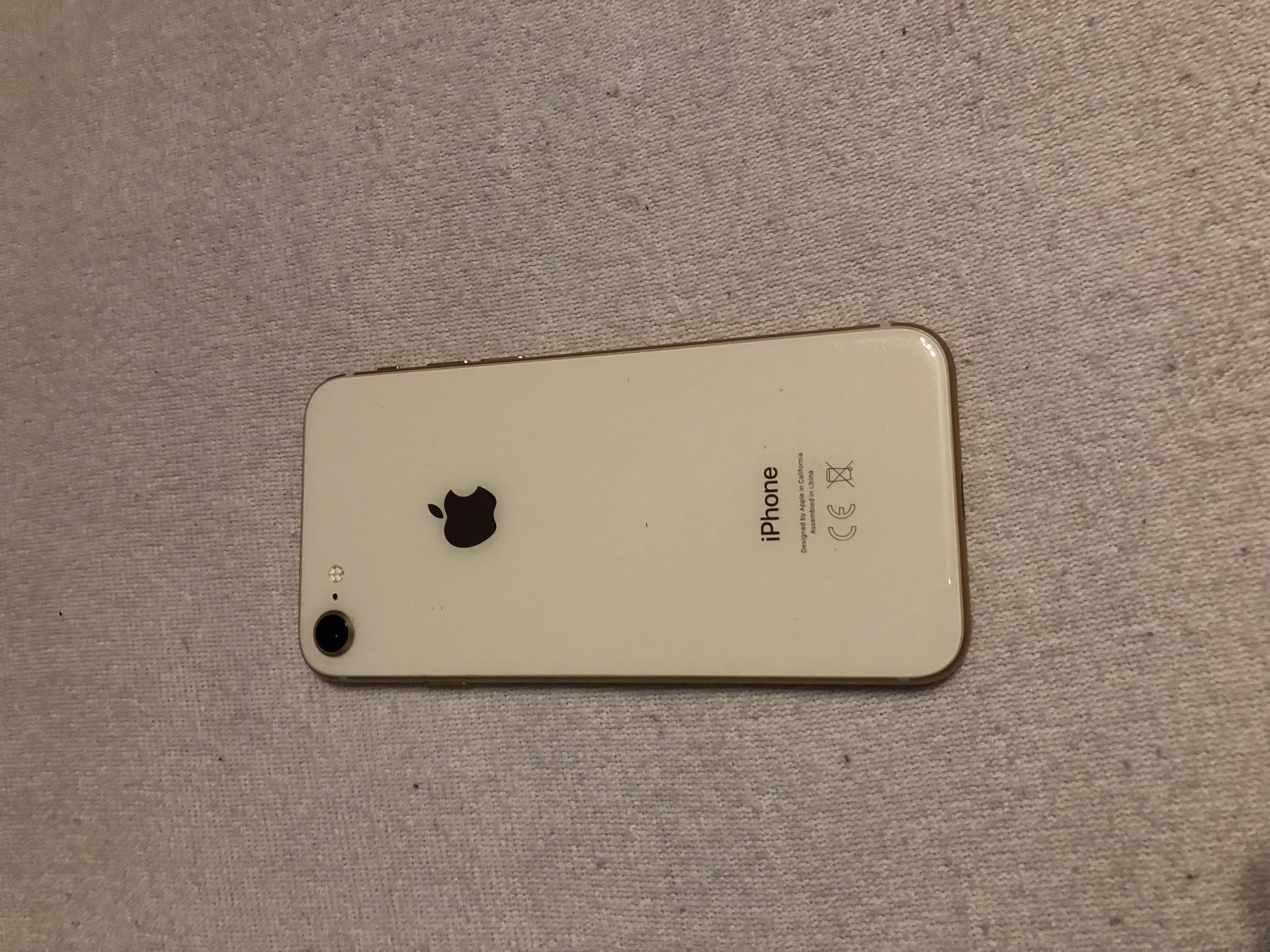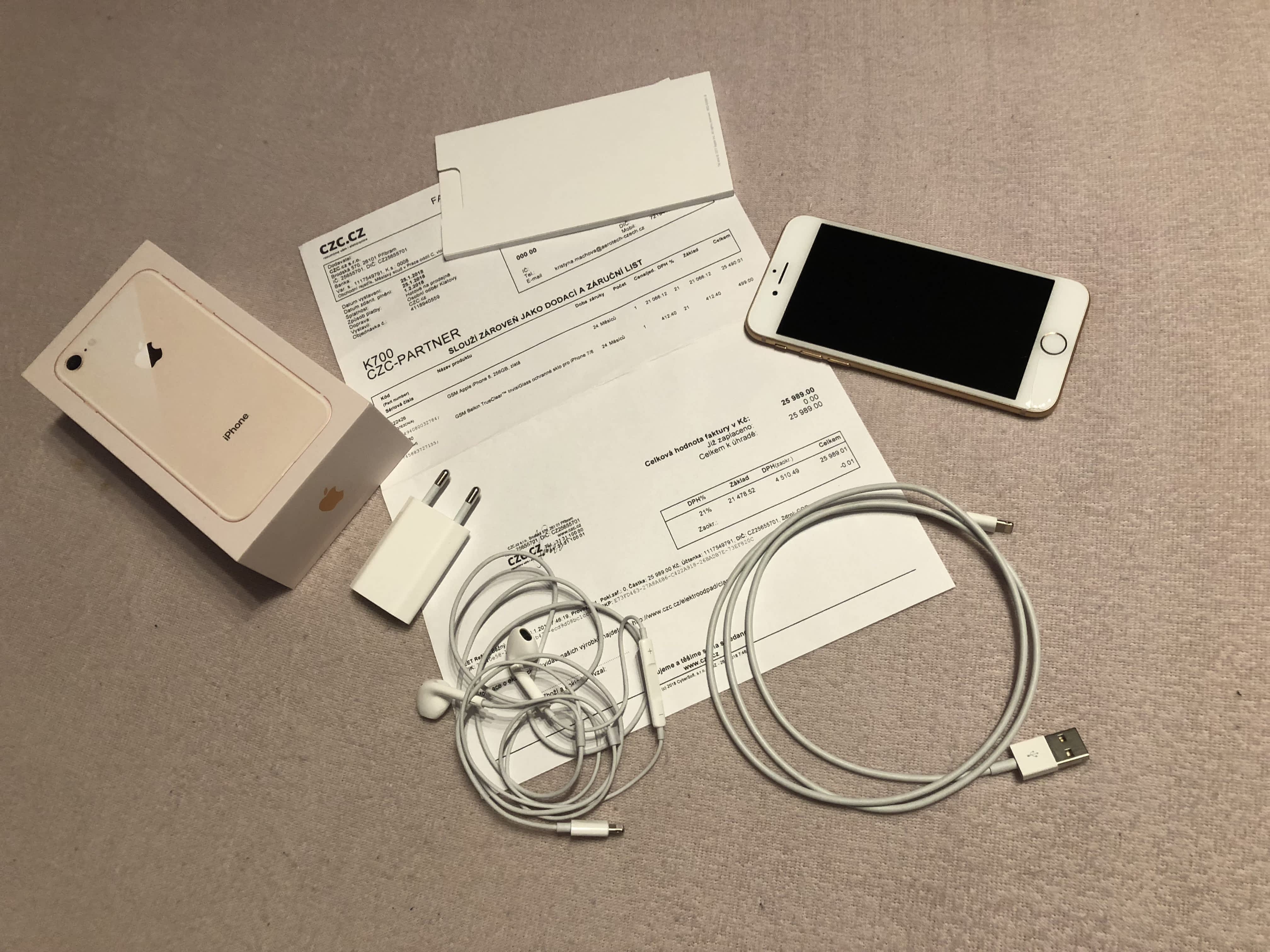Prodám Apple iPhone 8, 256GB, barva zlatá. Koupen 25.1.2018. Na telefonu ochranné sklo, displej prasklý – nepatrně viditelná prasklina od tlačítka k levé straně. Původní cena 25 989 KČ.