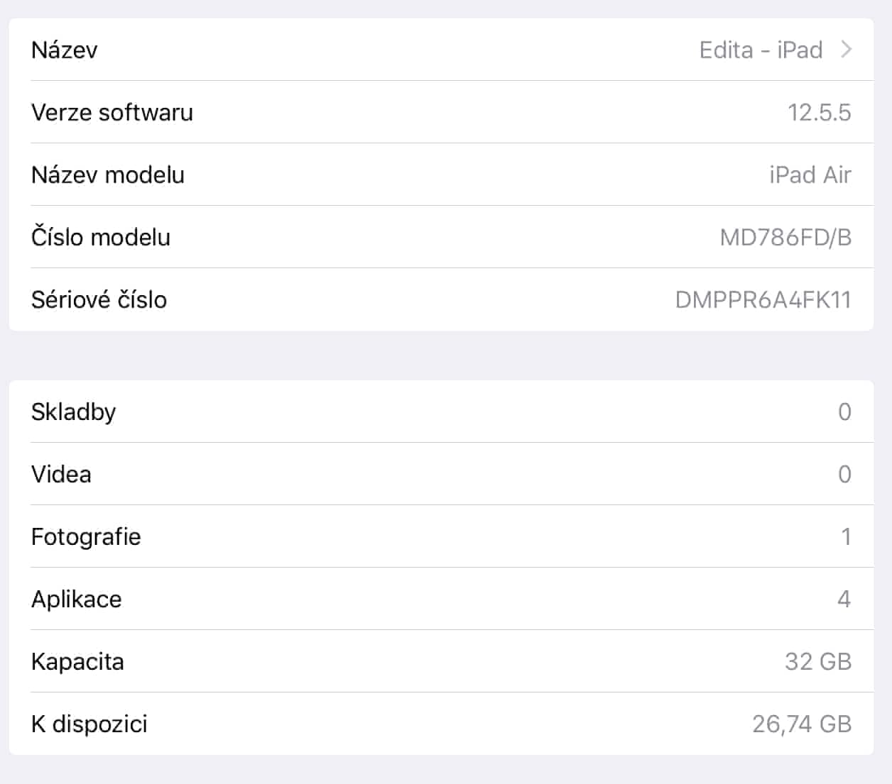Prodám dva plně funkční iPad Air 32GB (model MD786FD/B) bez viditelného poškození, Displej bez škrábanců. Stav baterie v příloze. Včetně kabelu a zdroje. iPad bude odhlášen, smazán a připraven k přihlášení nového ID uživatele. Upřednostňuji osobní předání dle domluvy na Moravě, 4.12., 13.12. a 14.12. v Praze. Ostatní dle domluvy. Cena 7FK11 za 1.950,- Kč, 4FK11 za 2.200,- Kč. V případě dotazů mě kontaktujte emailem.
