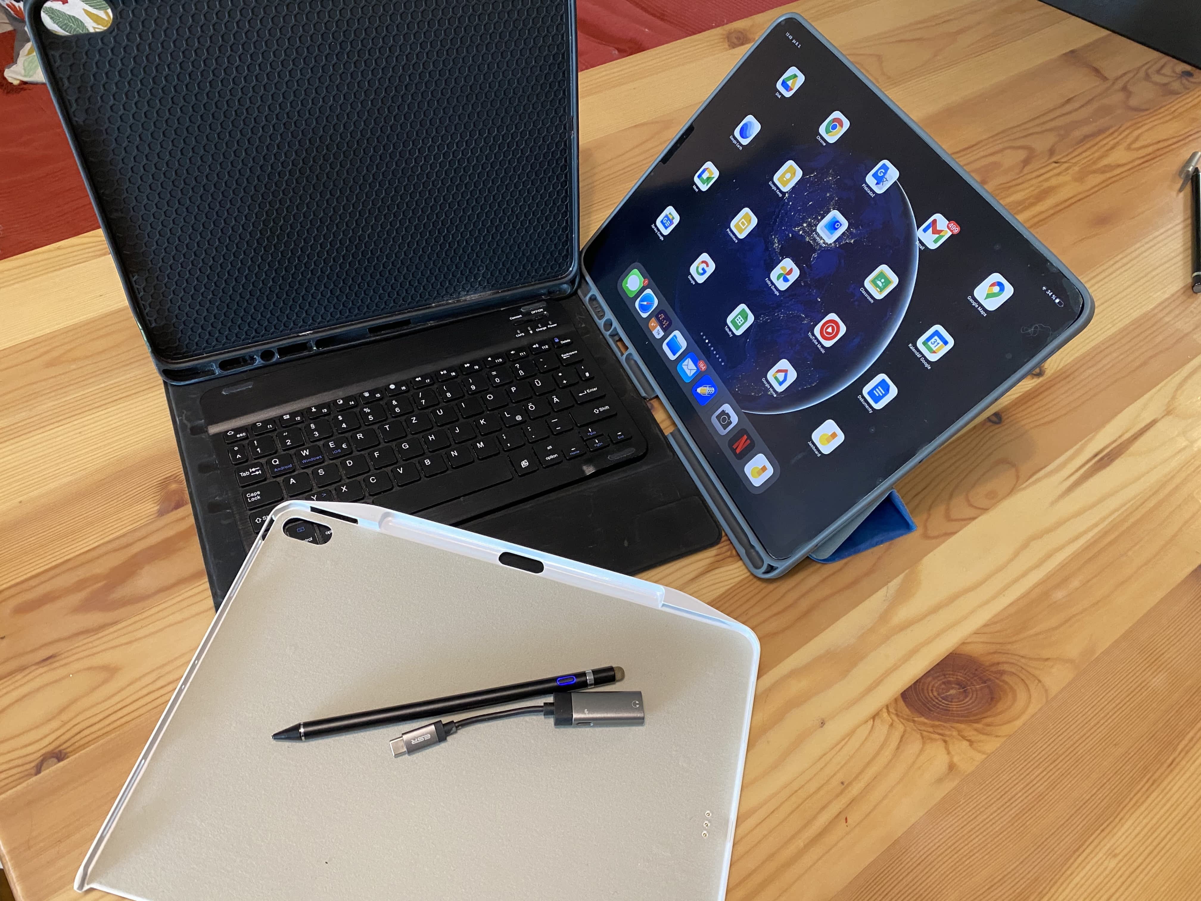 jsou tři druhy obalů, bezdrátová klávesnice, neoriginální synchronizační a nabíjecí kabel,digitální tužka ESR . Na iPadu je nalepena folie Nilkin AR paper-like, reflexní matná folie se zdrsněným povrchem připomínajícím papír, vhodná pro kreslení a psaní. IPad bych prodal za 19 000kč s ohledem na ty pošramocené záda.