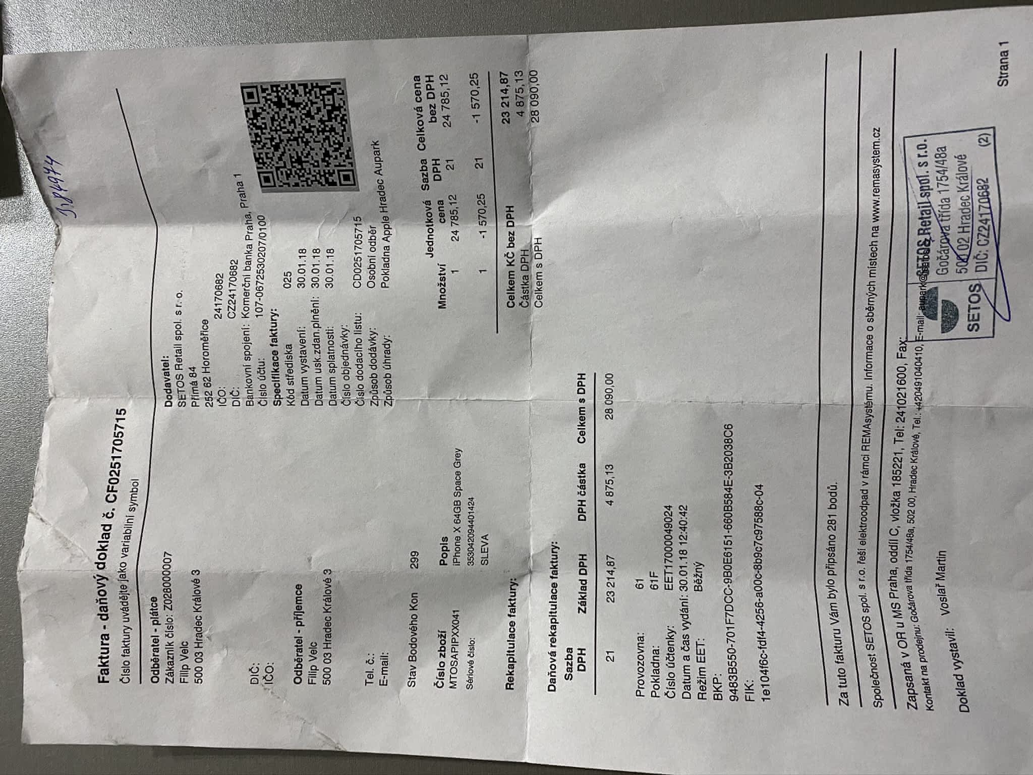 Prodám Iphone X 64 GB. Po celou dobu nošen v obalu. Součástí baleni ochranne sklo,kryt Spigen, nabíječka a nové nepoužité sluchátka a kabel Zakoupen v Setos 30.1. 2018