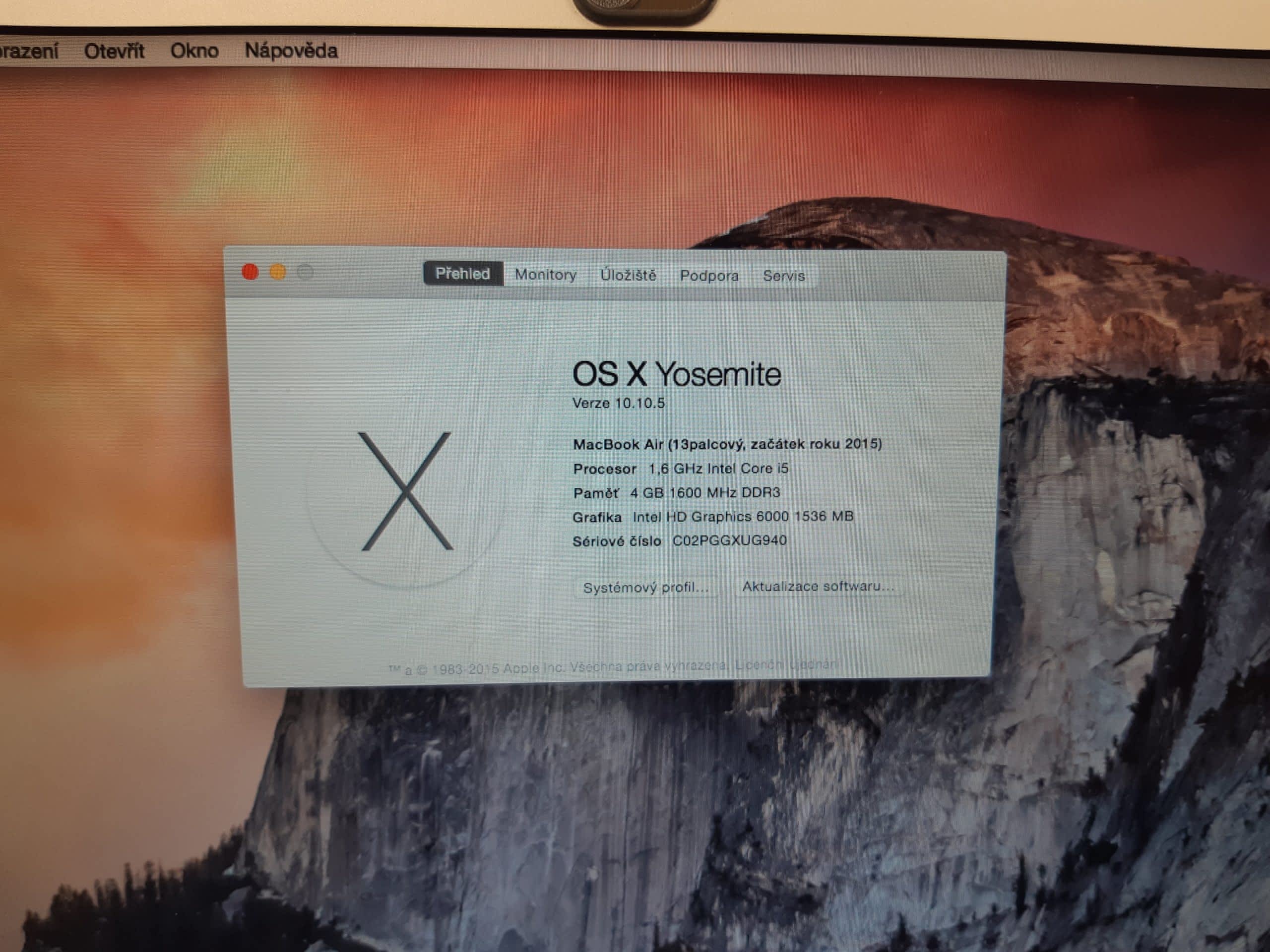 MacBook Air, začátek roku 2015, Core i5 1,6GB, 4GB RAM, 128GB úložiště. Baterie 143 cyklů. Notebook je jakjo nový, pouze malý flíček na zádech. K notebboku je nabíječka a brašna. Notebook je jako nový.