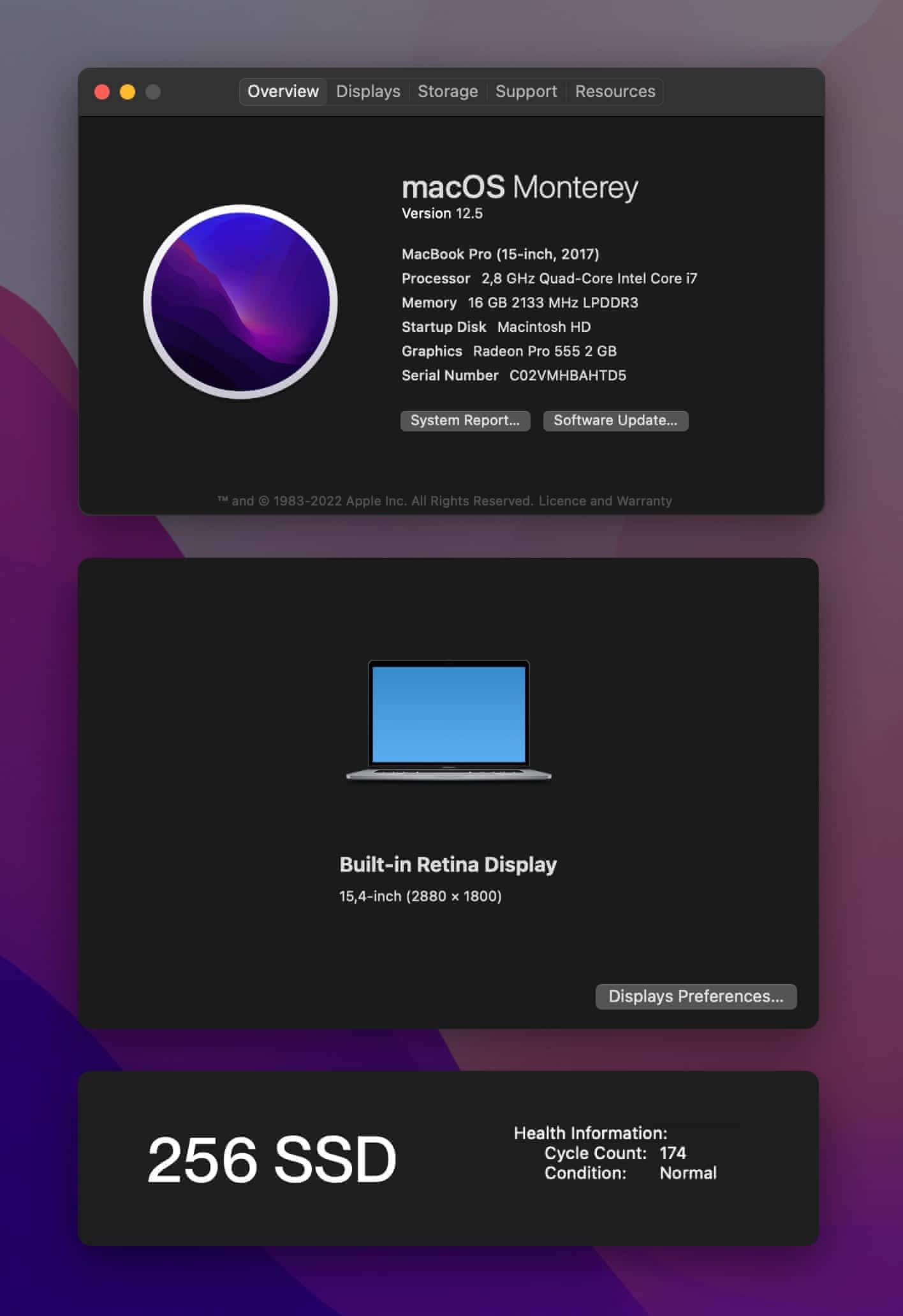 O macbook bylo pečlivě zacházeno ale je čas přejít na nový model. V rámci Apple záruky byl před rokem vyměněn vnitřek > kvůli klávesnici. Baterie má tedy jen 174 cyklů – takže funguje a vydrží velice skvěle.
