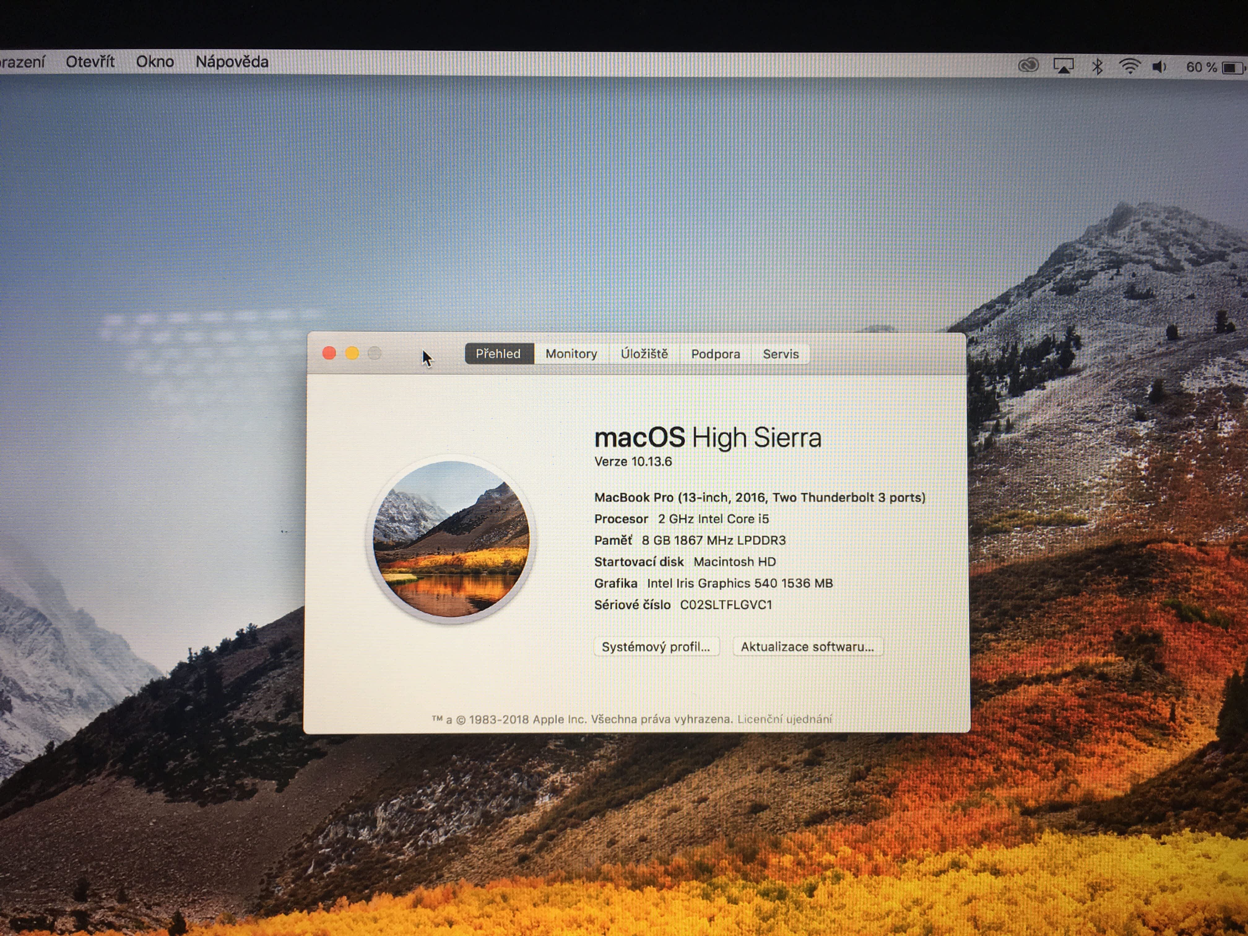 Prodám málo požívaný MacBook Pro 13" 2016, Intel CORE i5 2 GHz, 256 GB, paměť 8GB, Intel Iris graphics 540 1536 MB, 119 cyklů nabití. Součástí balení je i adaptér Apple USB-C to USB. Prodej z důvodu přechodu na jiný typ PC. Záruka platí do 10.11.2018. Preferuji osobní předání.