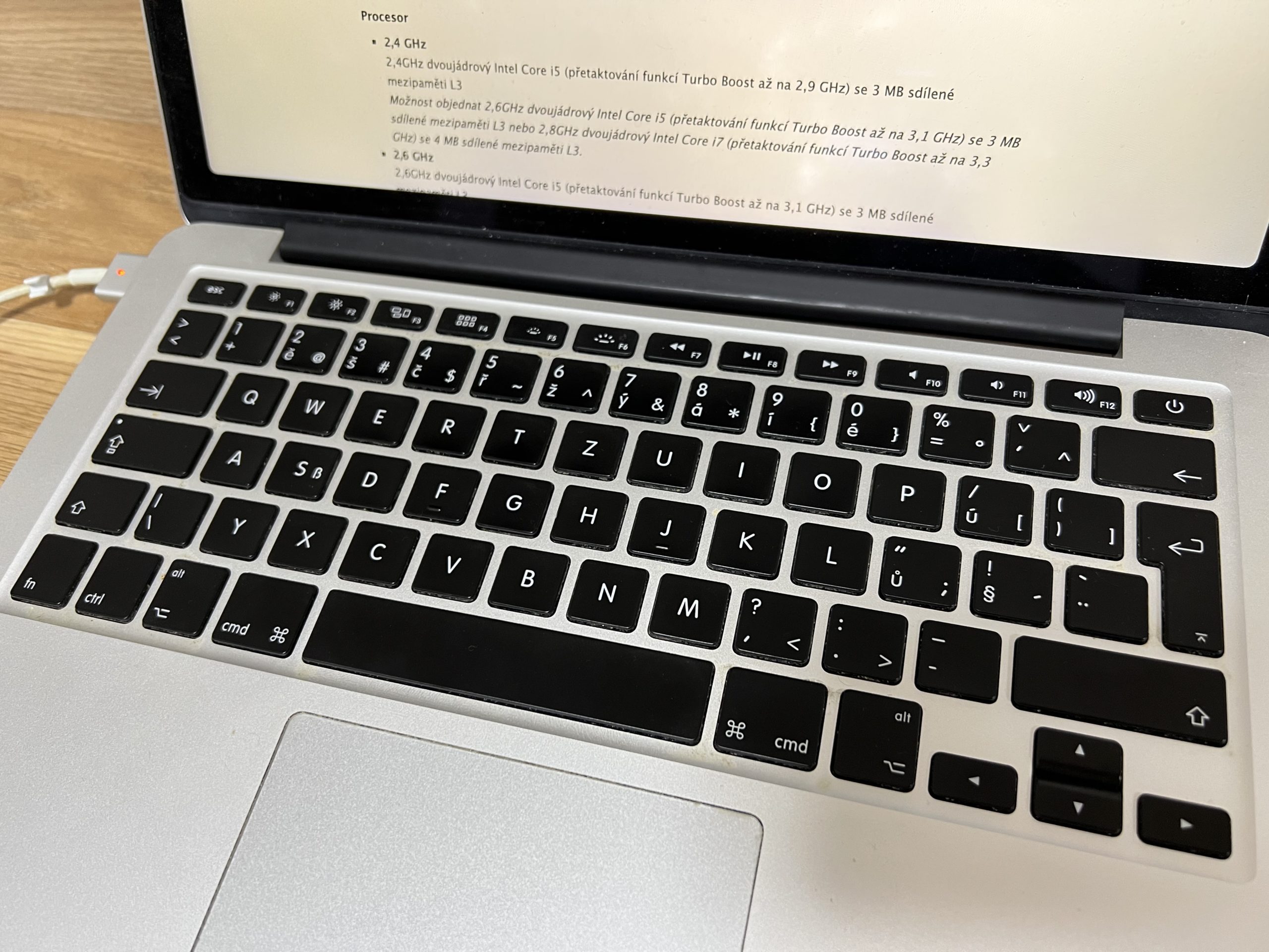Prodám Retina Macbook Pro 2013 Late, SSD 512 GB, 8 GB RAM, Intel Core i5 2,6 GHz (2 core), počet cyklů akumulátoru 526 (stav "normální"), jack 3,5 mm, 2x USB A, 1x HDMI, integrovaná čtečka SD karet, 2x thunderbolt, nabíjení magsafe. Hodně používaný – klávesnice nefunguje spolehlivě (někdy je nutné některé klávesy zmáčknout opakovaně) – možná ji bude stačit nechat vyčistit, možná ji bude nutné vyměnit nebo používat externí klávesnici. Chybí jedna gumová noha. Cena za Macbook Pro + nabíječku s prodlužovacím kabelem. Jako bonus přidám zdarma adaptér thunderbolt => VGA a thunderbolt => Ethernet (RJ45). Pouze osobní předání v Praze (4D Center ve Vršovicích).