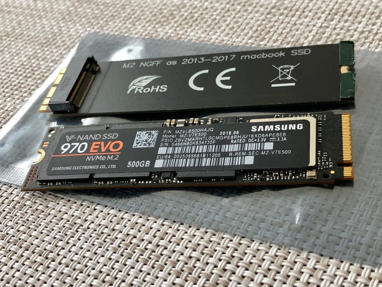 Prodám M.2 PCIe NVMe modul Samsung 970 EVO 500GB (označení MZ-V7E500BW a záruka je až do konce května 2023) spolu s adaptérem Sintech ST-NGFF2013-C (M.2 PCIe SSD Adapter for Upgrade of 2013-2017 Macs).