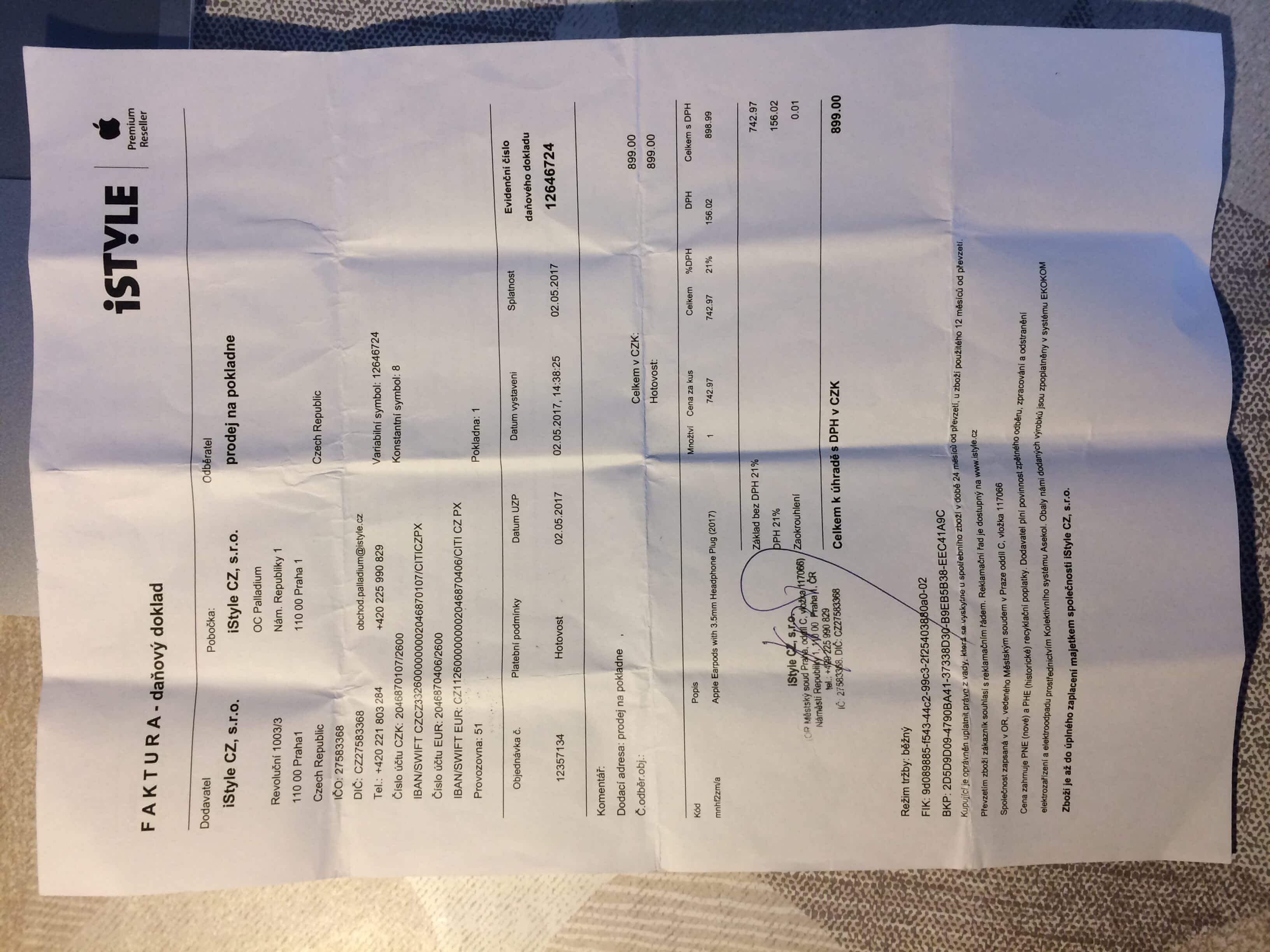 Úplně nová Apple sluchátka, 3,5 mm headphone plug, v originálním balení, zakoupená v obchodě iStyle, se zárukou za 899 Kč
