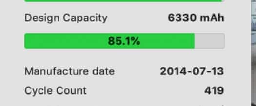 Baterie má 85% kapacity, 419 cyklů ale stále vydrží dost dlouho.