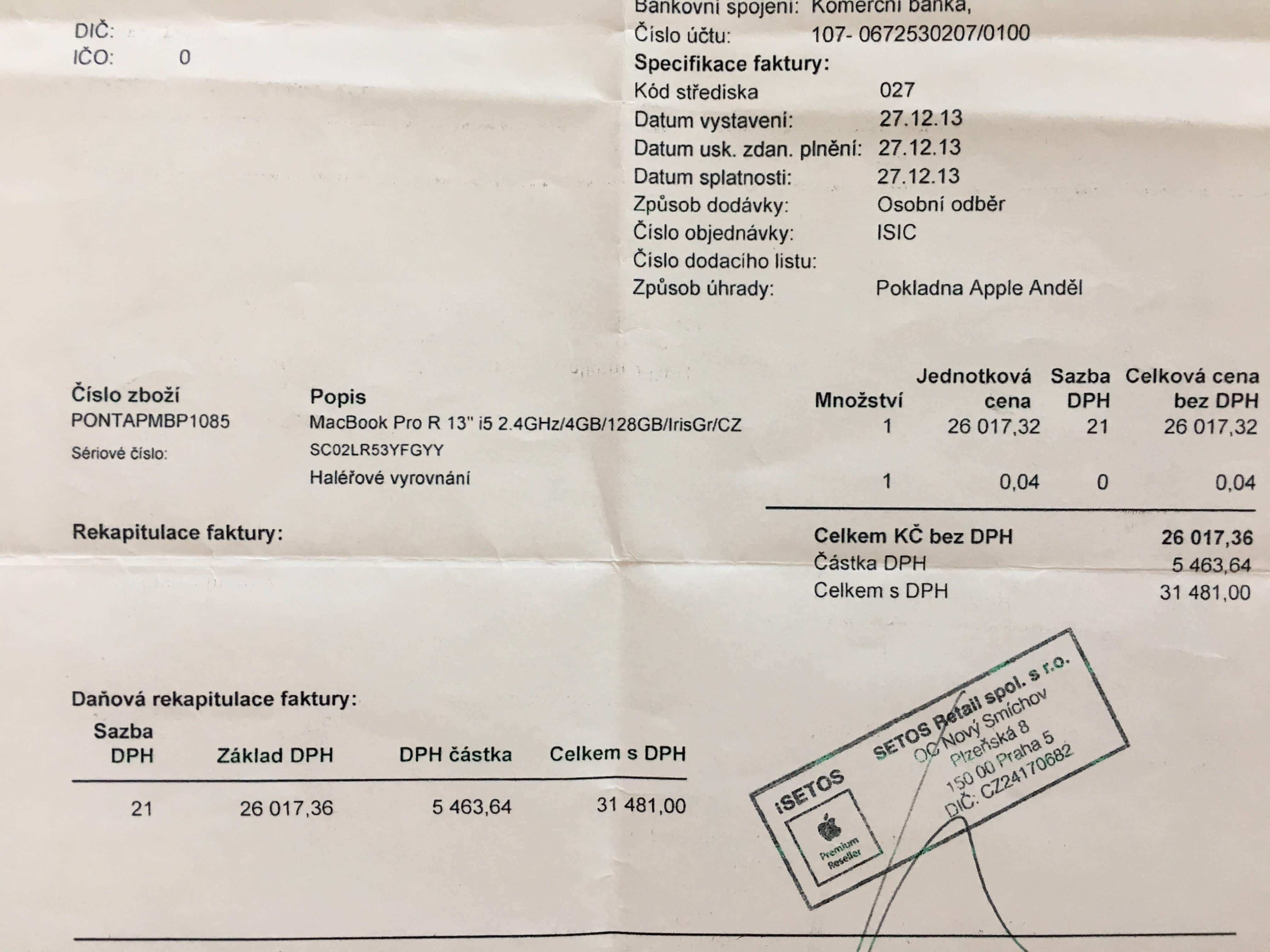MacBook byl zakoupen 27.12.2013 v iSetos.