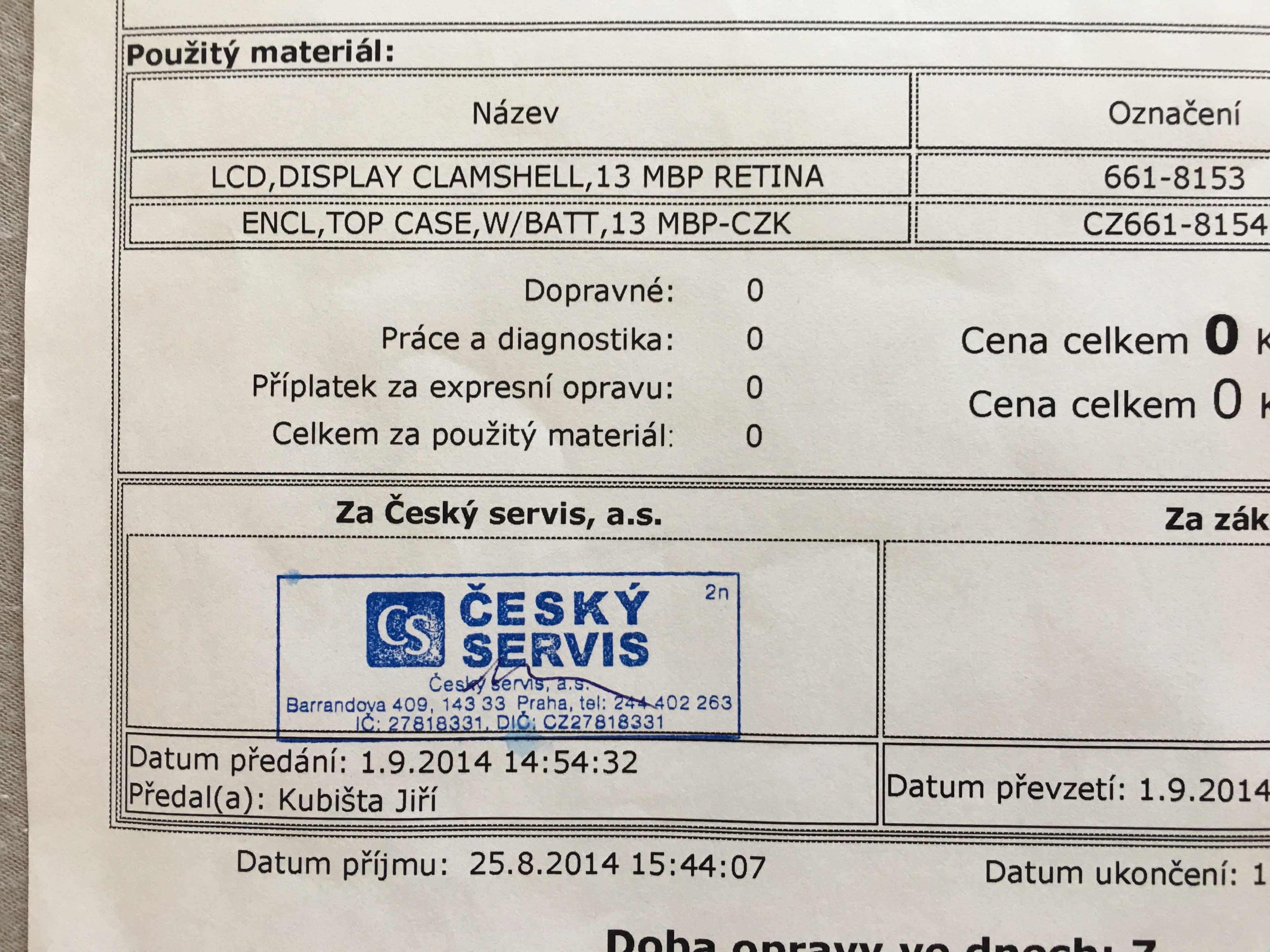 MacBook byl 1.9.2014 v rámci záruky na výměnu spodní části(baterie,touchpad,klávesnice a tělo) a chybou technika musel být vyměněn i displej.