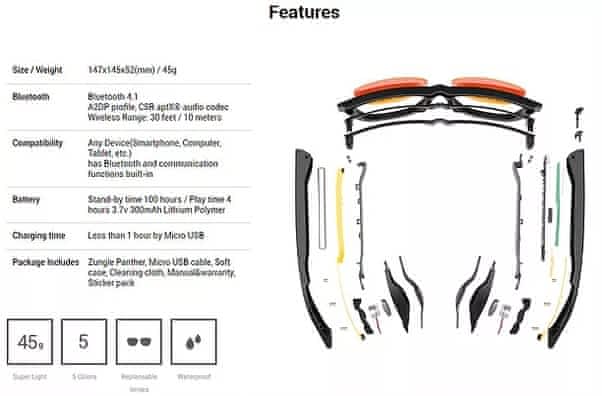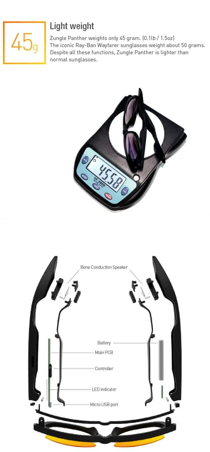 Tyto velice elegantní brýle jsou vybaveny kondukčními reproduktory, které přehrávají zvuk přes bluetooth z mobilu přímo do lebky pomocí vybrací, které jsou v uchu převedeny na zvuk.