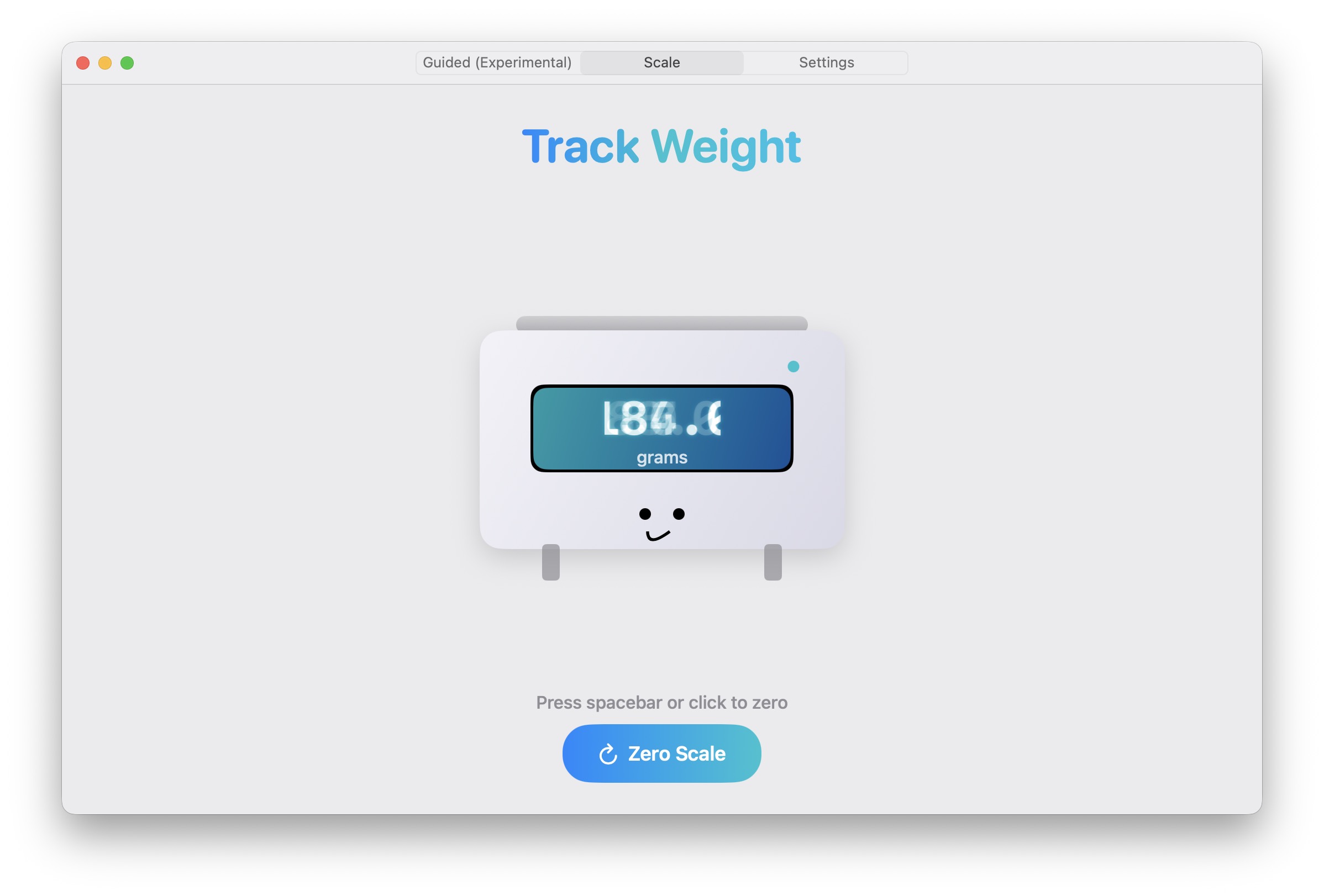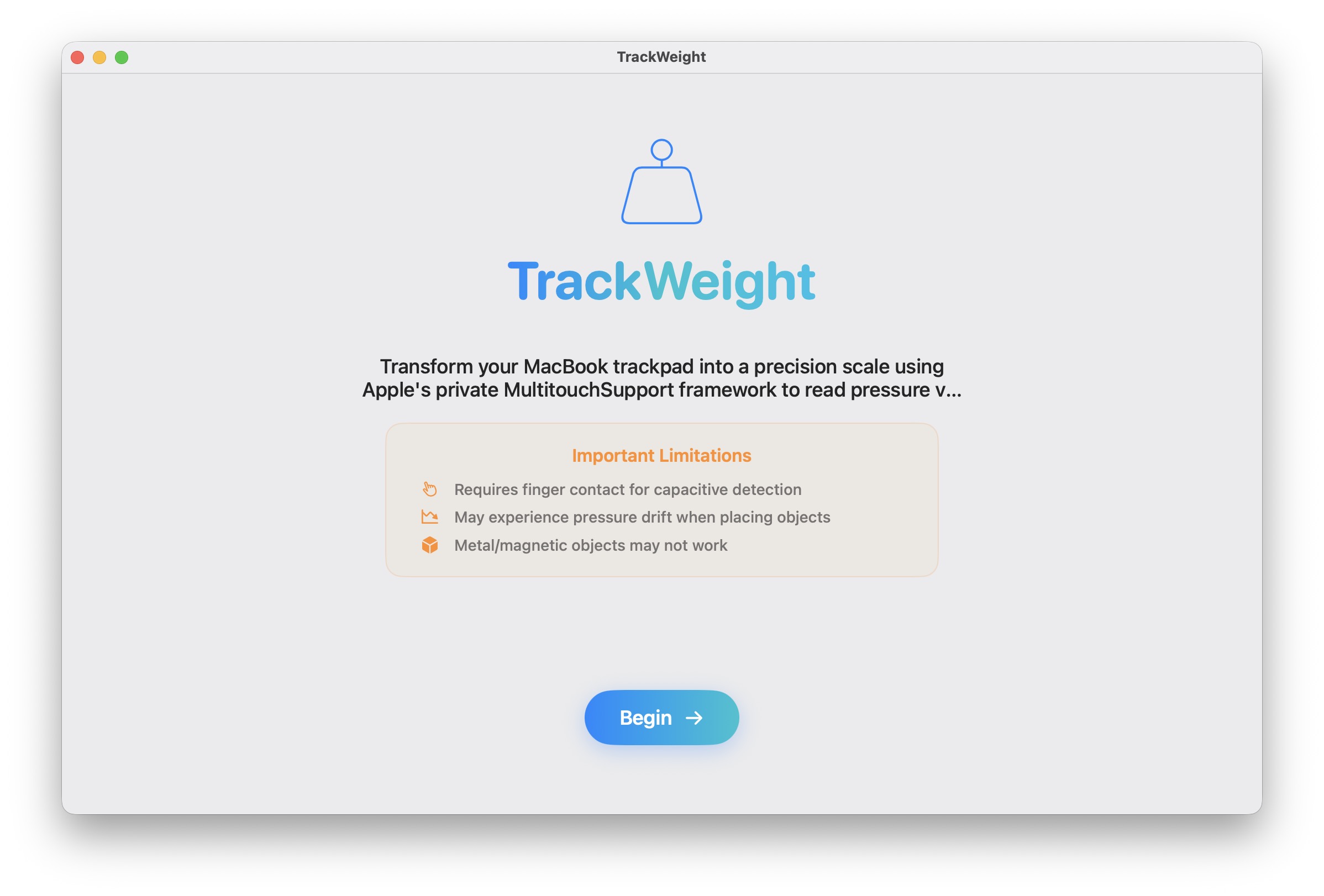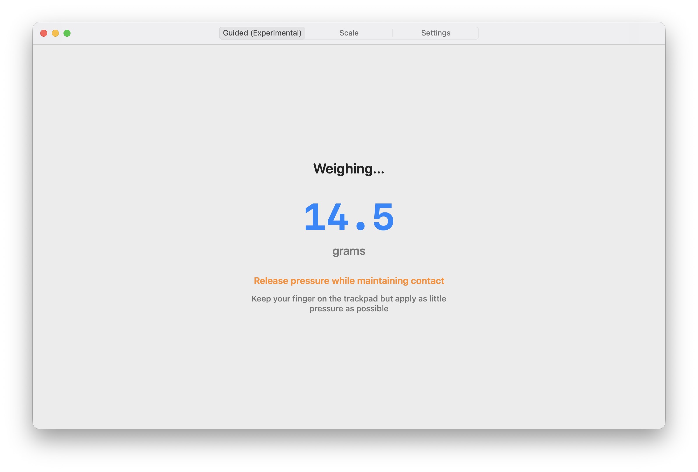 Приложението TrackWeight е много лесно за използване. След като го изтеглите, инсталирате и стартирате, ще бъдете посрещнати от опростен потребителски интерфейс, където можете да измерите налягането върху тялото си trackpad с пръст (раздел „Везни“) или претеглете предмети чрез експерименталната функция в раздела „Насочване“. За да работи измерването, трябва постоянно да го наблюдавате trackpadс поставен върху него пръст. Trackpad Работи капацитивно, така че без пръста ви ще бъде „мъртъв“ и няма да измерва нищо. Веднага щом обаче пръстът ви е върху trackpad Слагаш го (и няма значение къде, ние в редакцията го имахме например в горния десен ъгъл), можеш да сложиш каквото по-малко се побира върху него и след това просто да наблюдаваш как протича претеглянето.