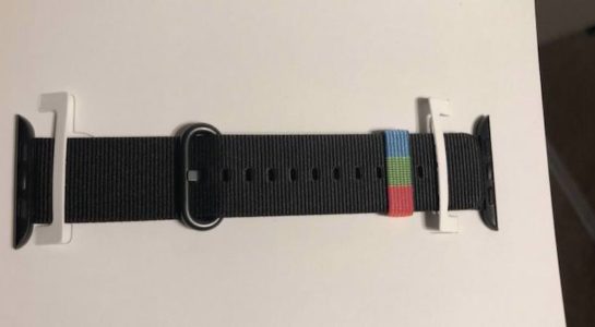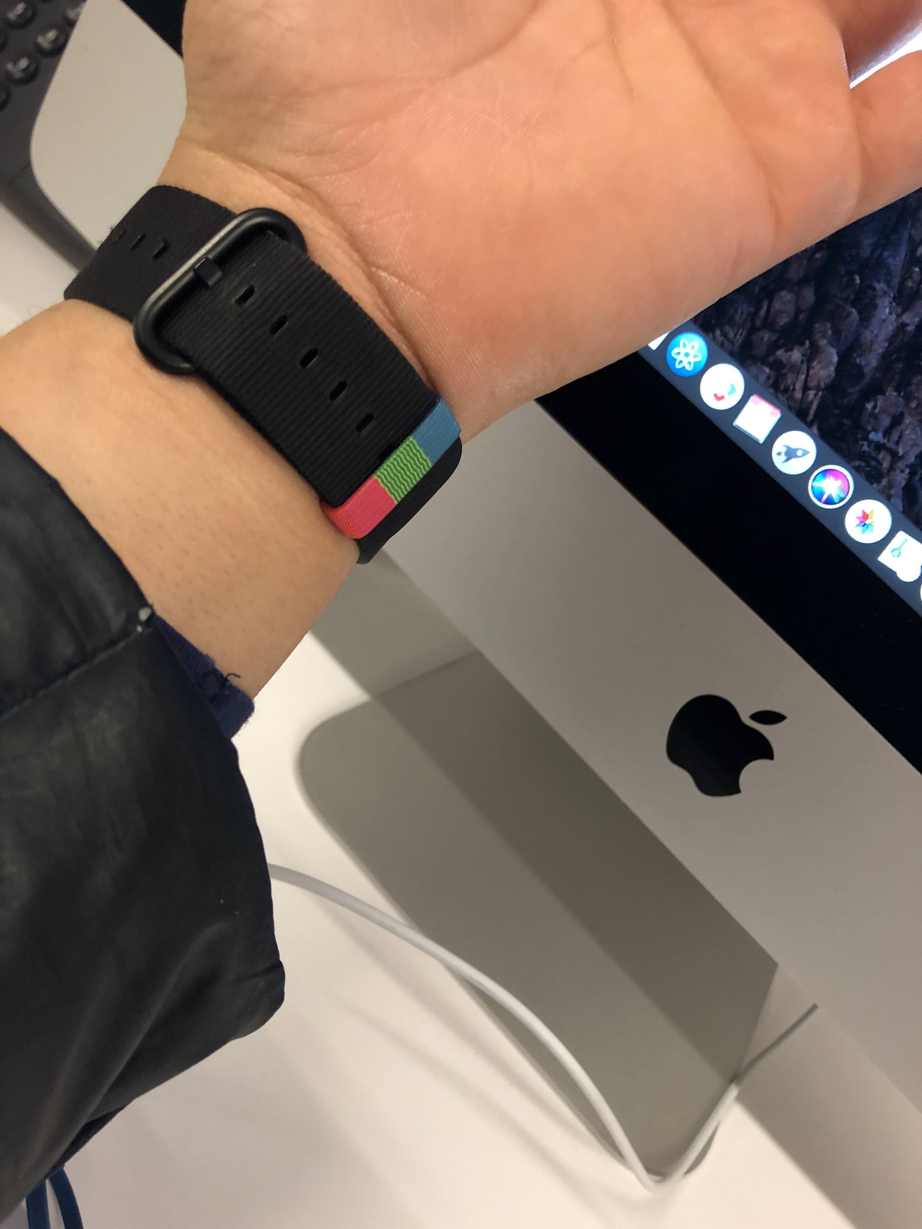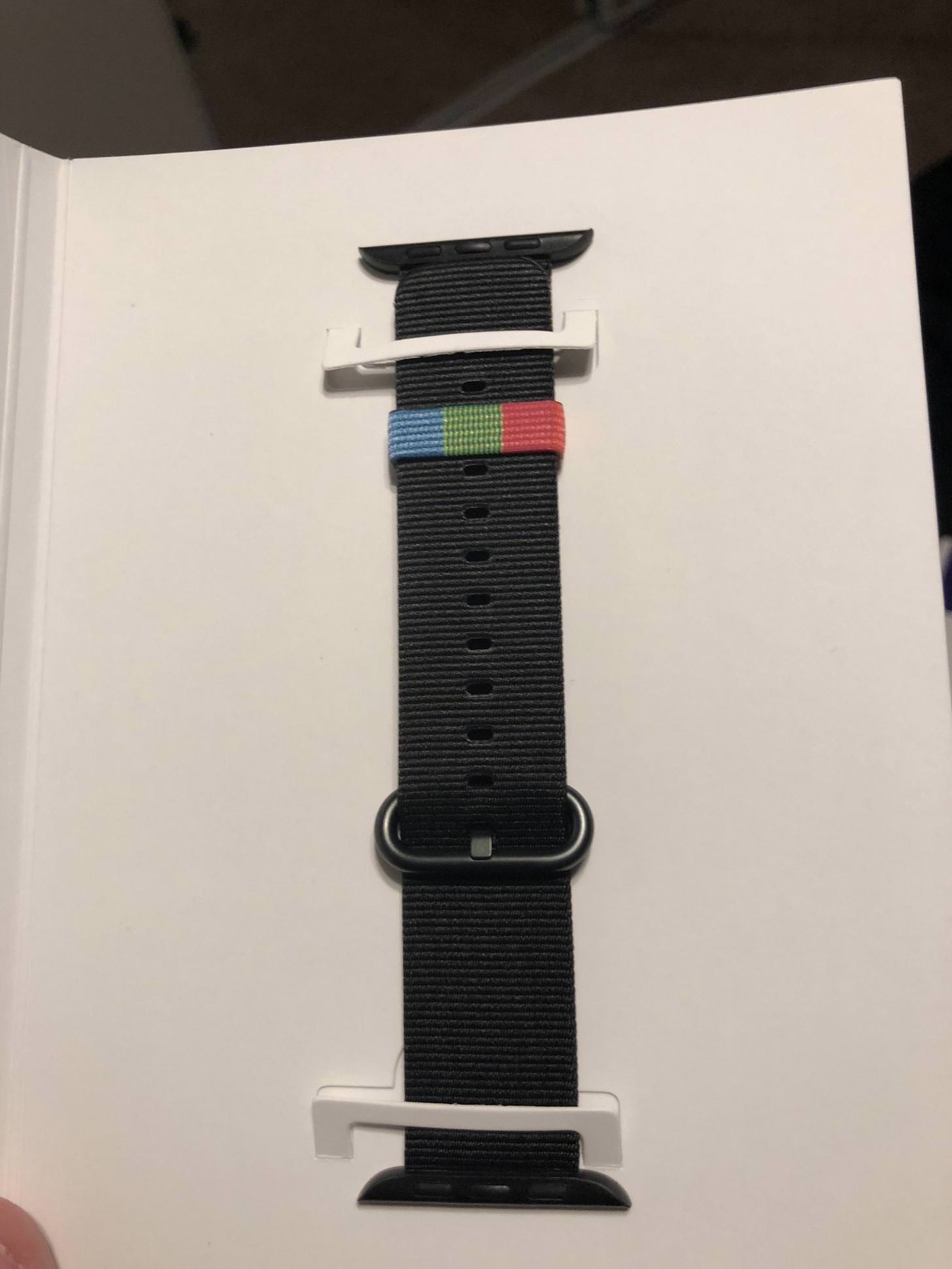 As you can see in the gallery above, it's a black nylon strap with a classic metal buckle and a red-blue-green overhang strap attachment strap. These colors are meant to symbolize the activity rings that employanceven on their own Apple Watch they closed all February to get their reward.