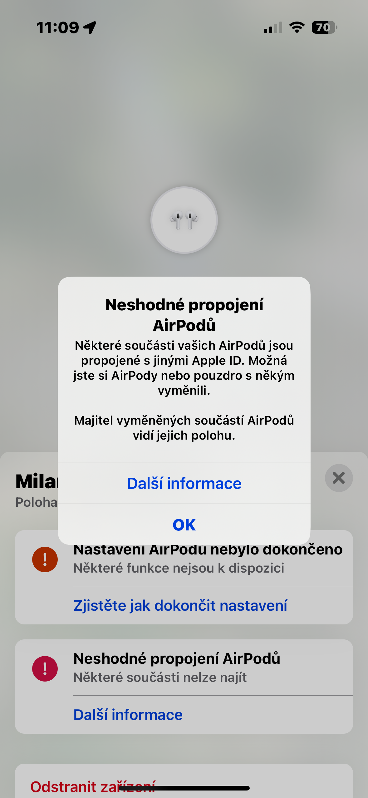 - Dobrý den,dnes jsem koupil použitá airpods pro 2 . Pán je odhlásil jak ze svého. iphonu i macbooku a mě pořád nejdou úplně spárovat do app. najít. Sluchátka fungujou. V "najít zařízení " to píše poloha nezjištěna,nebo Neshodné propojení Airpodů. Nevíte kde je chyba ? Děkuju za rady