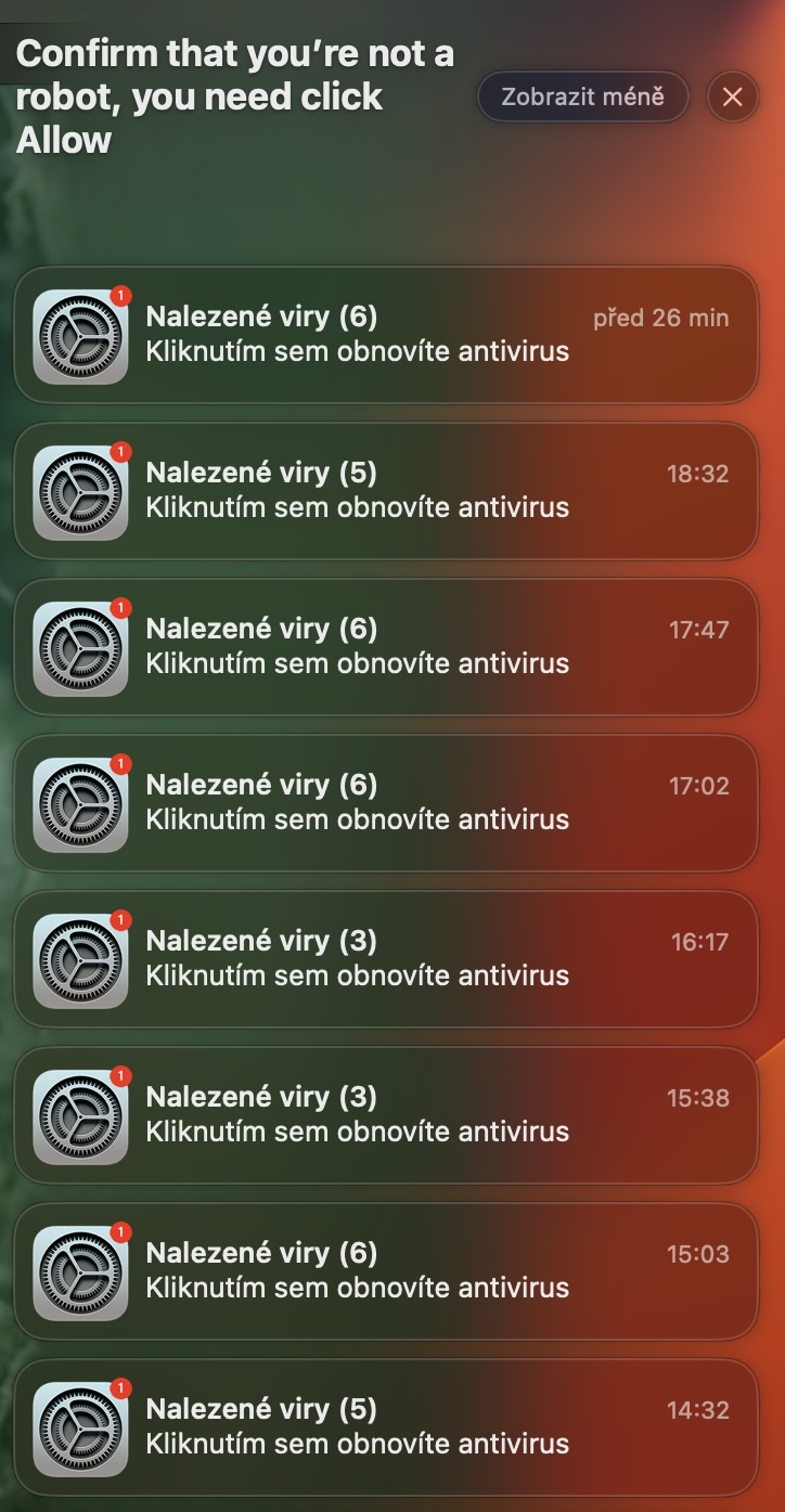 Zdravím a prosím o následující pomoc. Přešel jsem na nový MacBook Pro a od instalace programů mi z pravého horního rohu vyskaují hlášky o "nalezeném viru". Po kliknutí se pak ukáže stránka, kterou přikládám také. Prosím o radu, jak se problému zbavit, resp. zda s tím máte zkušenost. Děkuji za pomoc