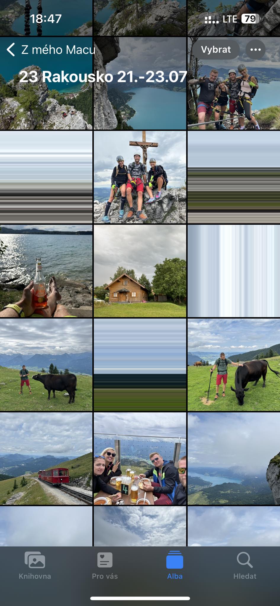 Zdravím, toto se mi stalo prvně po letech s iPhone a netuším důvod. Klasicky si na ntb s Win třídím fotky do složek a pak přes iTunes dám sync, abych měl fotky v iPhone dle složek, pak fotky z hlavní galerie smažu. Bohužel při poslední sync se mi v sekci "Z mého Macu" část fotek tváří jako barevné pruhy. V ntb vše v pořádku, po nahrátí na Google Photos taky vše v pořádku. Nějaké nápady? Zkusil jsem smazat, vytvořit složku znovu a stejný problém. Jsou to klasické fotky z defaulní aplikace Fotoaparát a nejsou žádnou aplikací upraveny. Díky. Vypadá to tako: