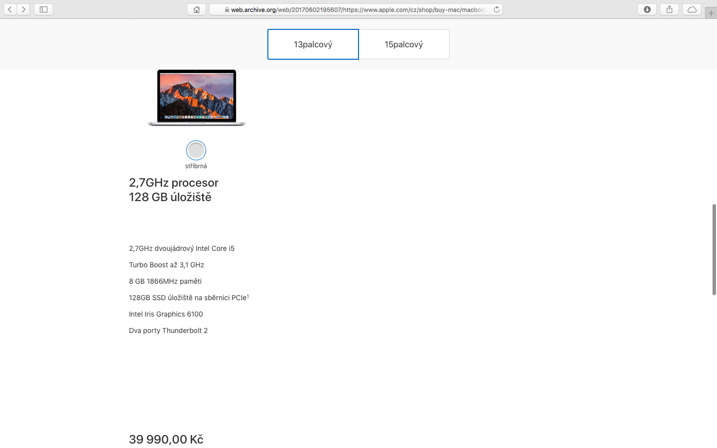 Kapacita SSD s kapacitou 256 GB (15,4palcová varianta s 2,8GHz procesorem), 256/512 GB (13,3palcová varianta), 512 GB (15,4palcová varianta s 2,9GHz procesorem)