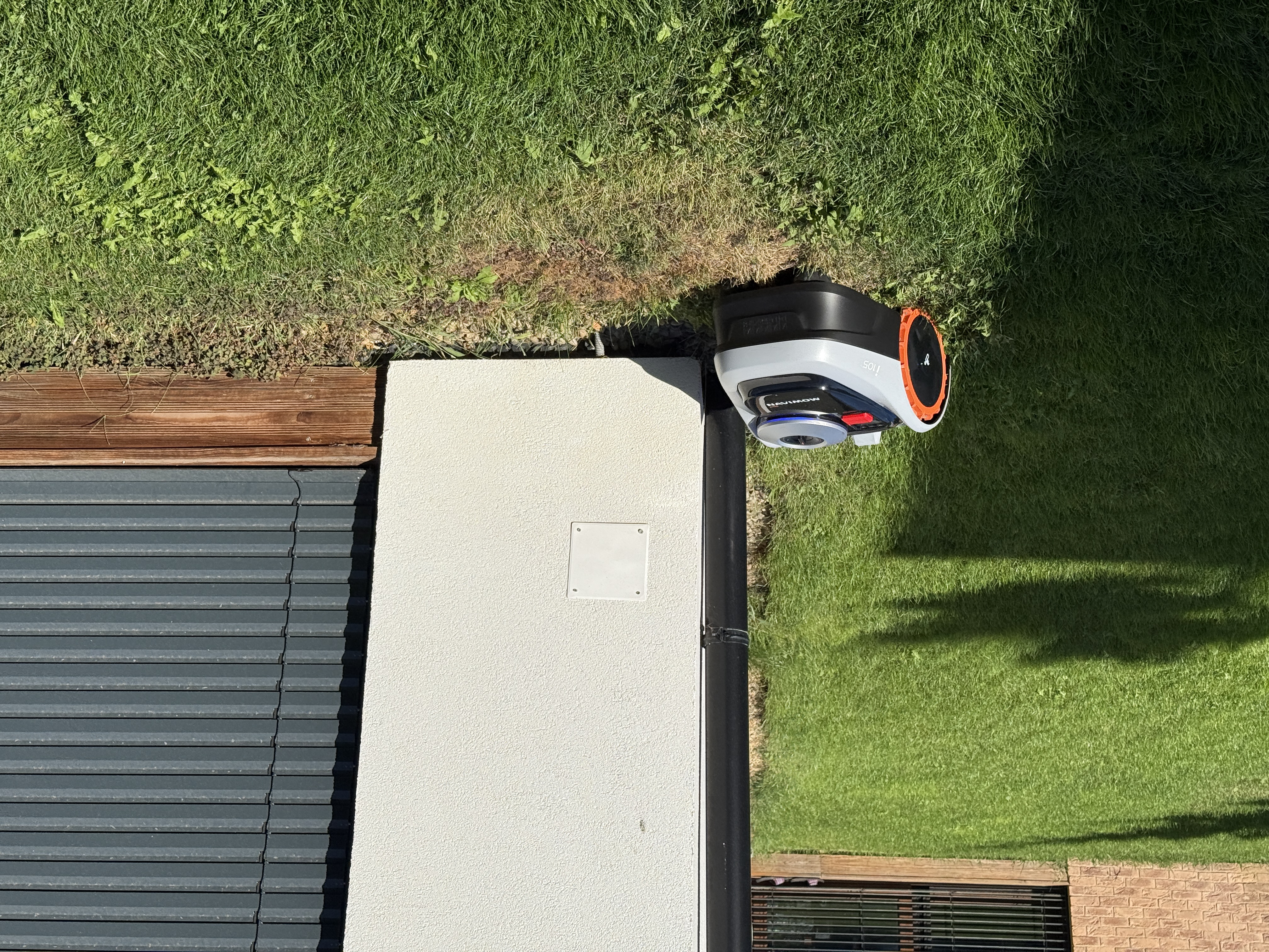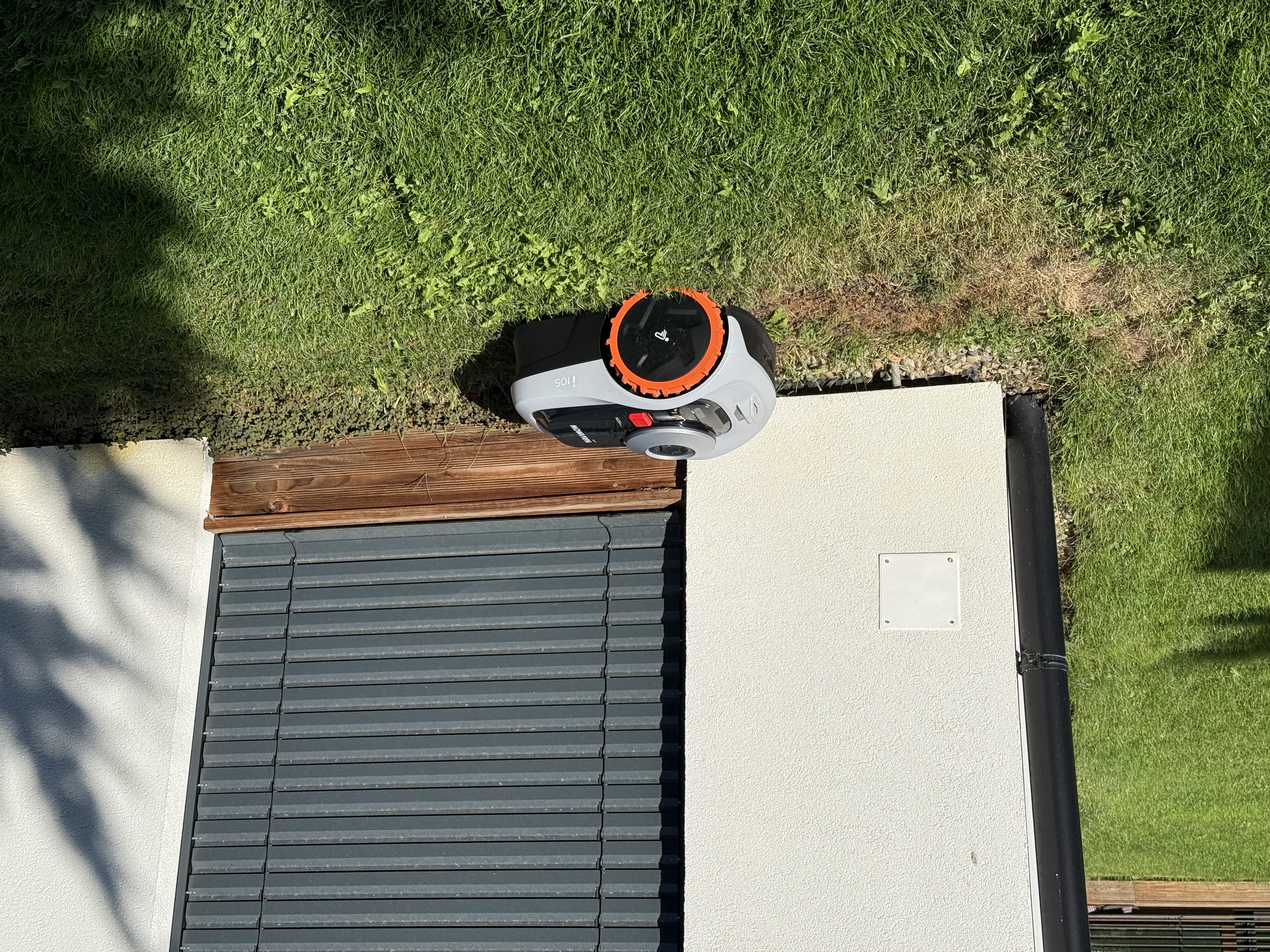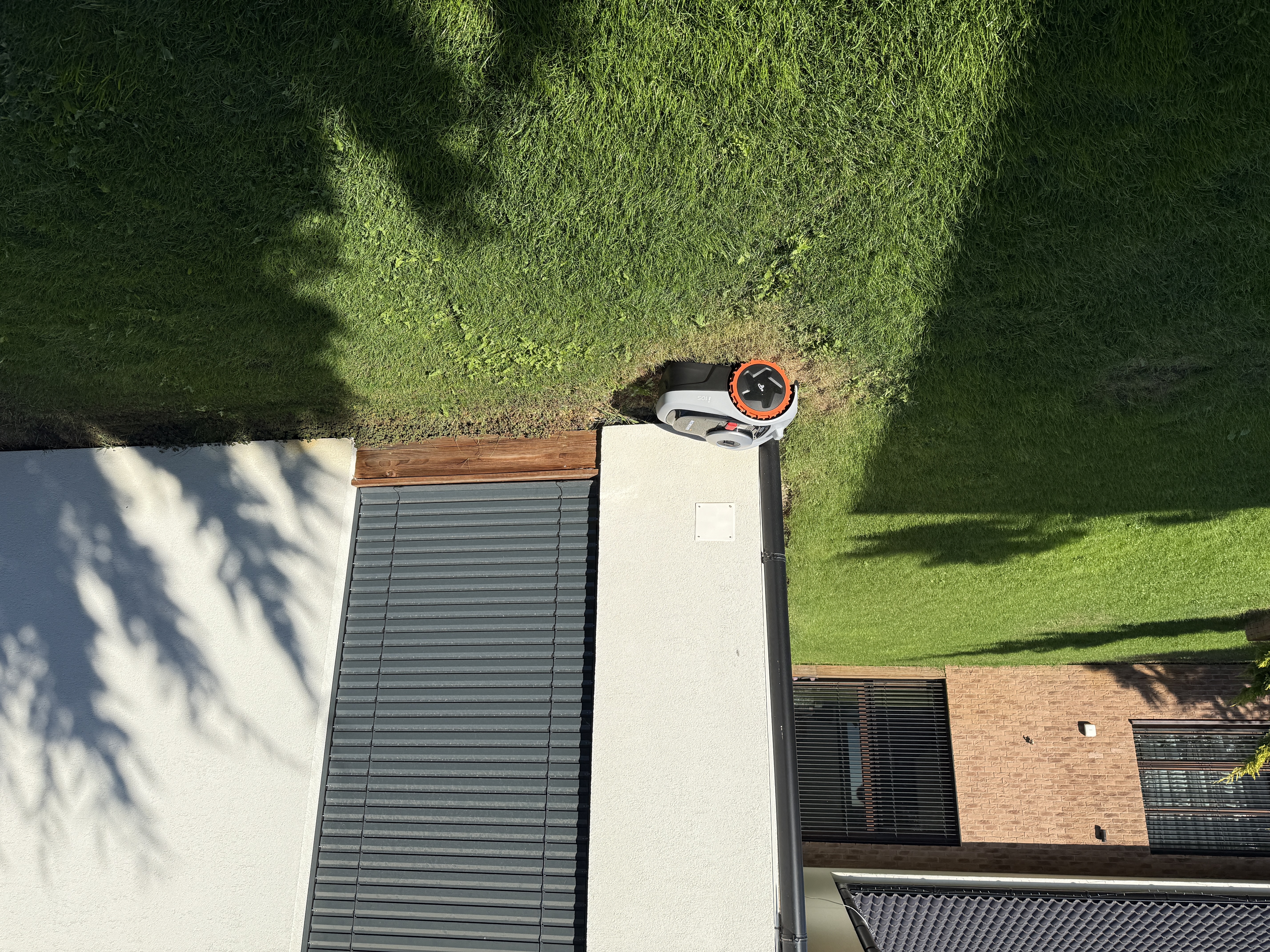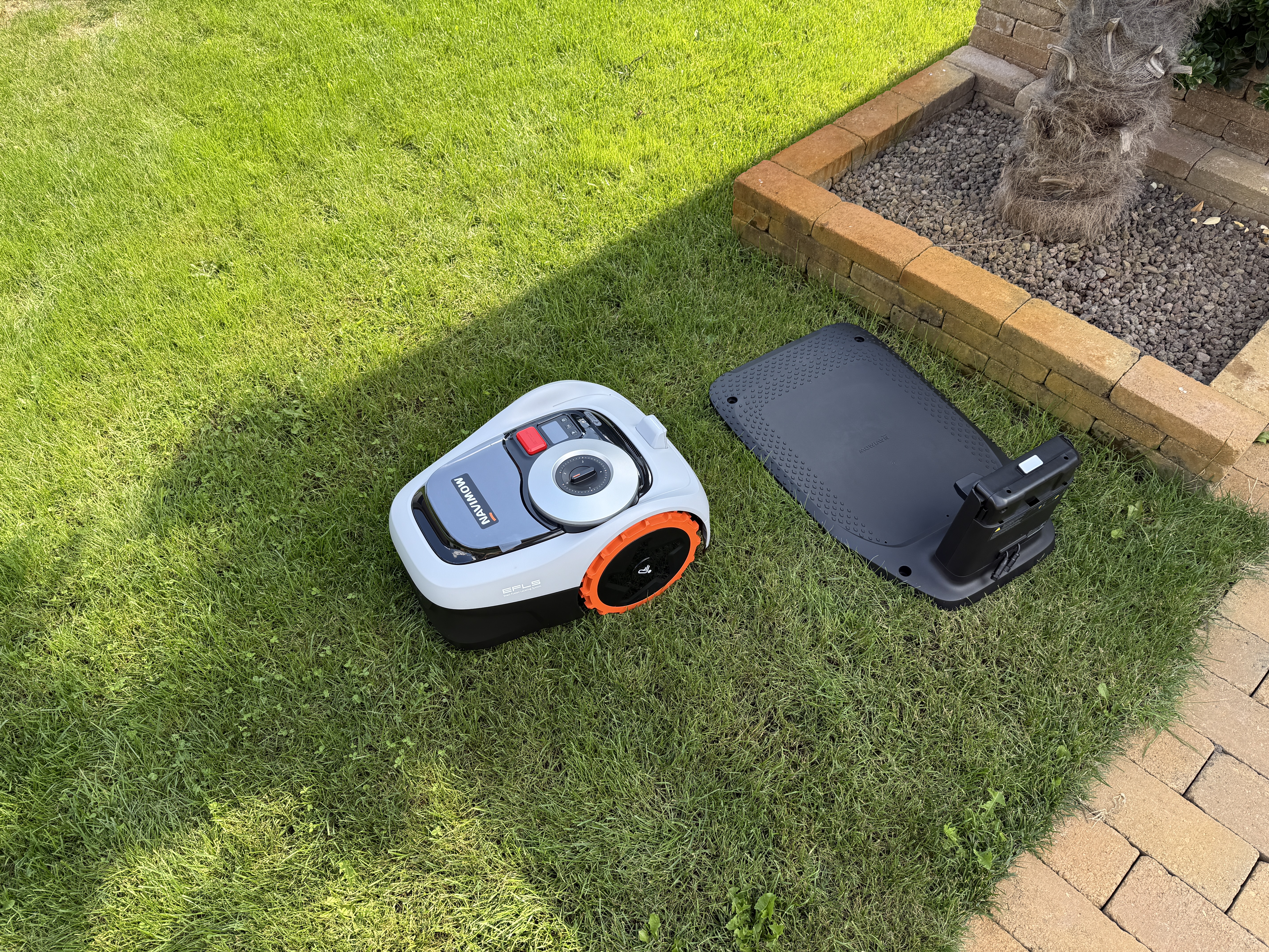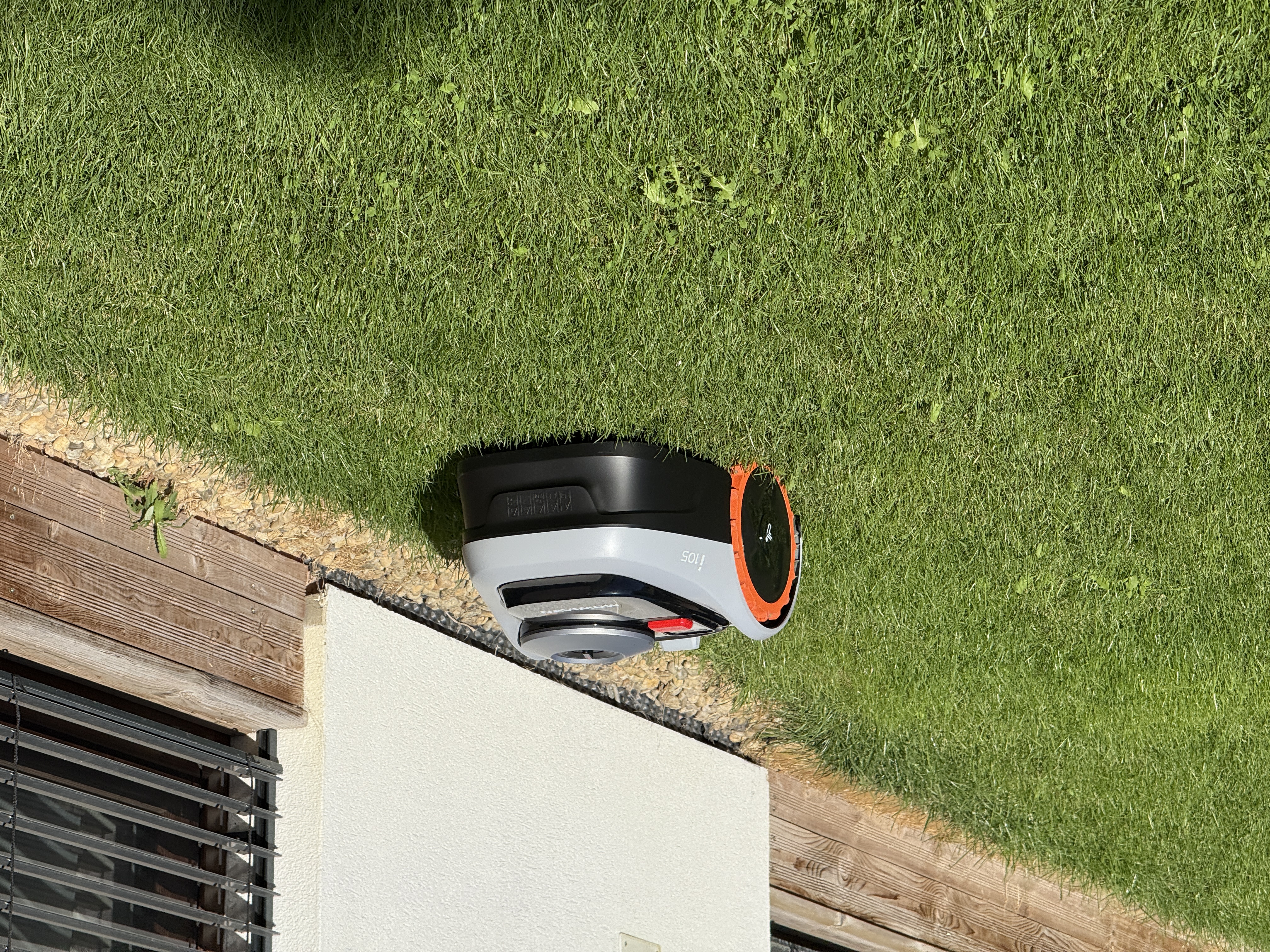 O importante é que o cortador de grama possa começar a cortar onde você especificar e alcançar esse local sem problemas fora do gramado. Assim, você pode colocá-lo, como eu, em pedras de pavimentação ou cubos ao redor da piscina, e o cortador alcançará o gramado sozinho. O mesmo se aplica se você tiver um gramado na frente de sua casa, uma passarela no meio da entrada e, em seguida, outro gramado. O cortador de grama não tem problema em cortar uma parte, depois atravessar a passarela e cortar a outra parte do gramado. Esta é uma vantagem inegável em comparação com cortadores de grama que precisam de fio-guia, porque isso é simplesmente impossível de fazer com um cortador de grama com fio-guia.