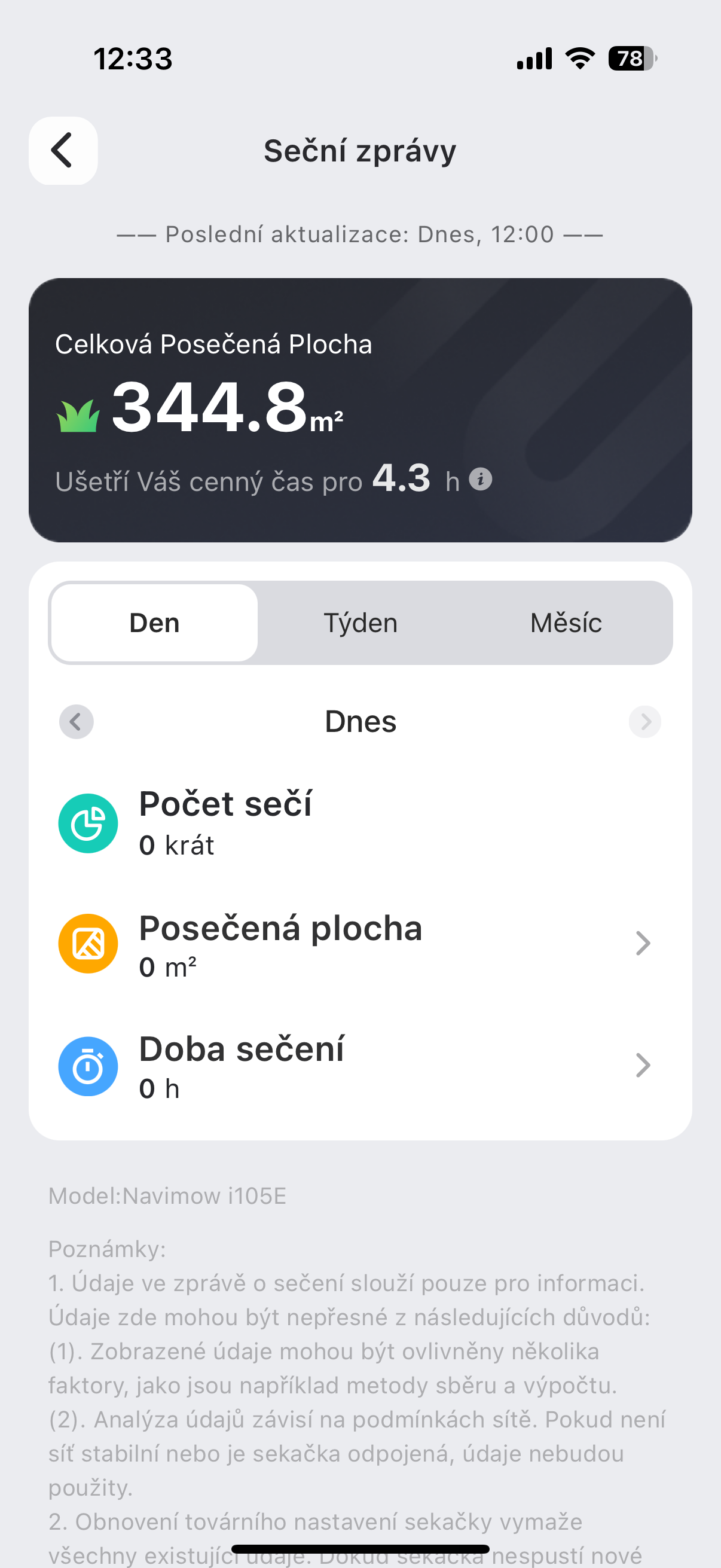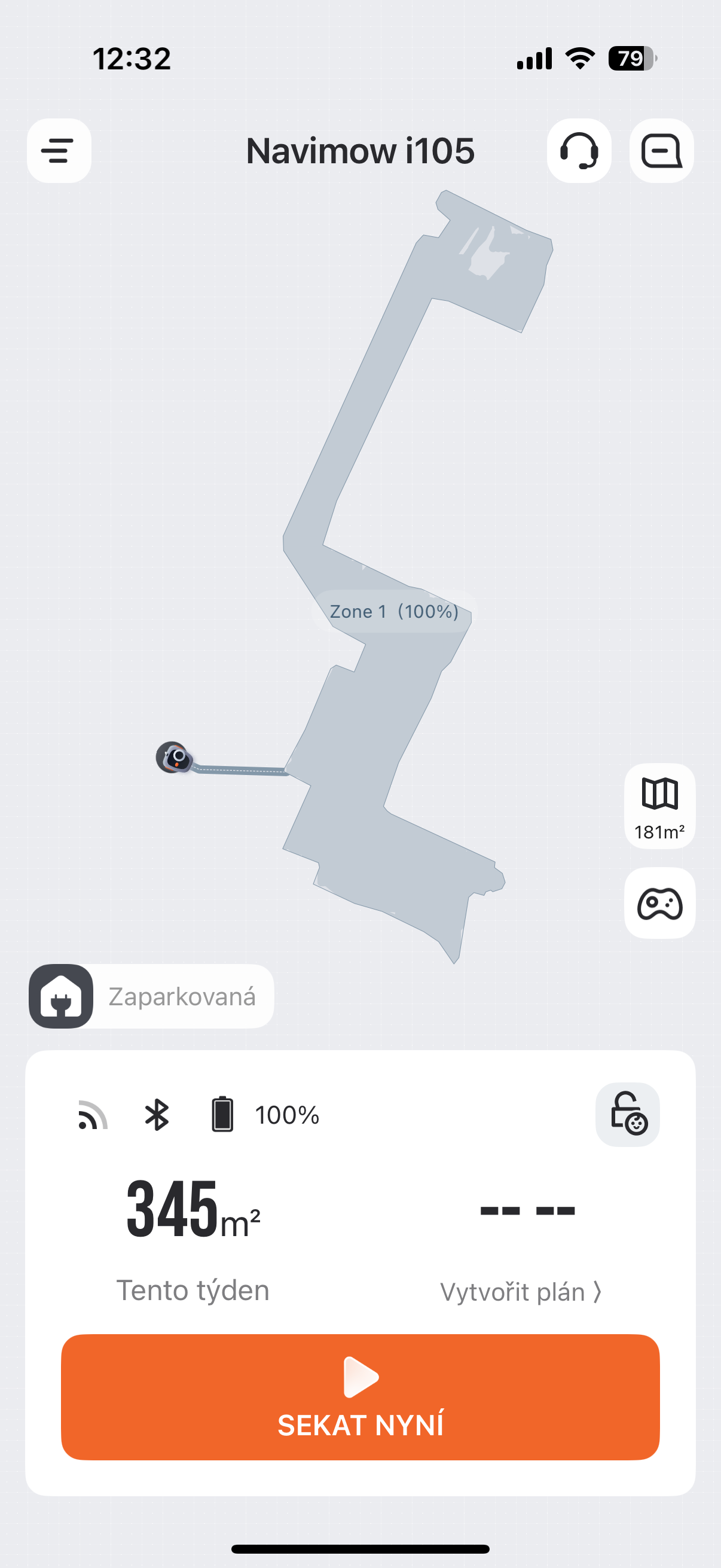 Quanto à duração da bateria, ela obviamente depende muito da robustez do seu gramado ou da frequência com que o cortador precisa girar. Faz diferença se você tem um jardim quadrado perfeito ou um jardim realmente acidentado como o nosso. No entanto, minha experiência mostra que o cortador pode cortar cerca de 180 m² de um jardim realmente acidentado com uma única carga, onde precisa girar com frequência. Claro, não importa se ele não consegue cortar o seu jardim com uma única carga - assim que ficar sem energia, ele carregará e continuará de onde parou. Até certo ponto, a maneira como ele corta a grama também é afetada por qual dos quatro modos mencionados acima ele está usando no momento. Quanto ao tempo, o cortador pode funcionar por cerca de 60 a 70 minutos com uma única carga. O carregamento de 0% a 100% leva cerca de 90 minutos, com você geralmente carregando de 10 a 12%, porque com 15% da bateria, o cortador retornará ao normal. dockestação de carregamento. A única pequena desvantagem é que, se o cortador não cobrir todo o jardim, mesmo que ainda tenha o último metro restante, ele primeiro carregará até 100% e só então terminará o trabalho. É uma pena que ele não calcule quanta energia precisa para cobrir o restante do jardim e não saia antes. Por outro lado, você pode iniciar a conclusão do corte a qualquer momento no aplicativo, independentemente do nível da bateria.